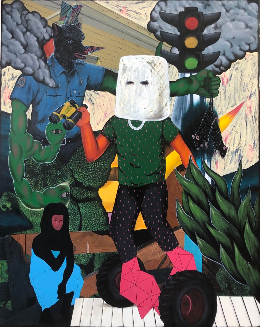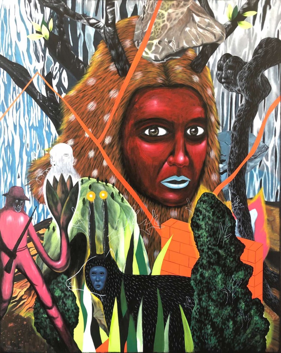 Tapaya creates forests, mountains and landscapes familiar yet otherworldly. The elements in the myths are juxtaposed with conditions prevailing in contemporary society, leading to complex amalgamations and montages. Modern symbols like traffic lights, binoculars, hot air balloons, wheels, weapons make appearances now and then in canvases thick with folkloric imagery. For example, in Lost in the Woods, an ancient, perplexing forest is linked to a pole with multiple direction signs, going every which way—showing an abundance of choices and the attendant confusion.