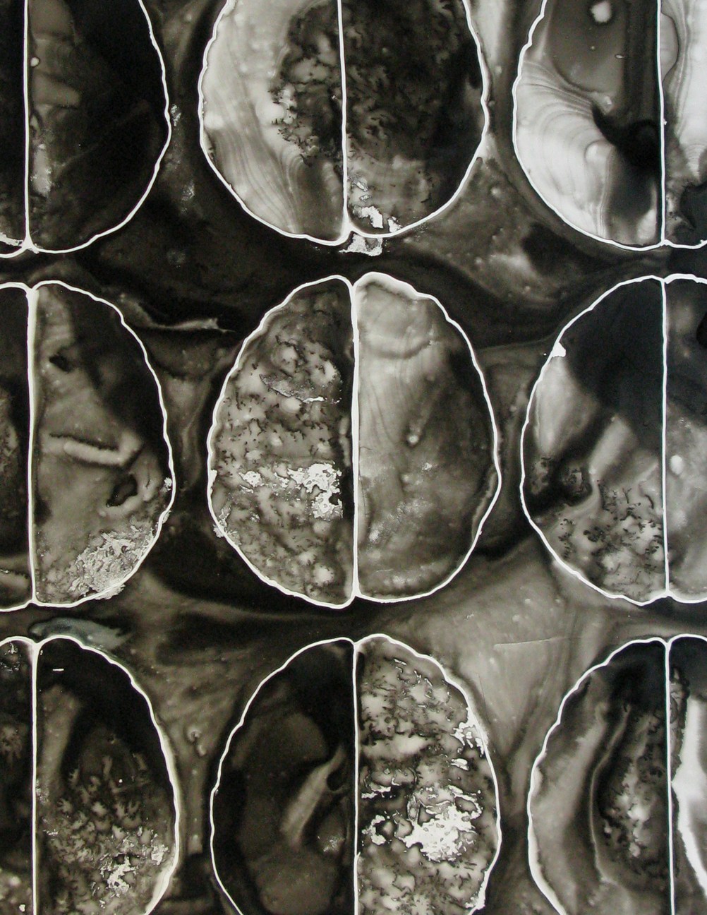 The Brain Scan series explores ideas of learning, memory and forgetting. She writes: “I draw a brain outline (based on an MRI image) with a resist on yupo, and then add ink and water, like information or sensations entering the brain. I let the “information” sit for a while, and then wash some of it away. This leaves “ghosts” and outlines, like half-forgotten facts. Then I repeat this process several more times, creating a multilayered landscape of the mind.”