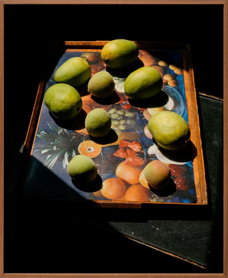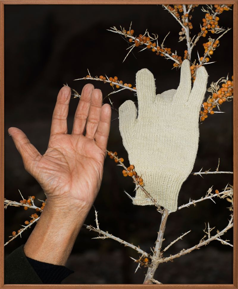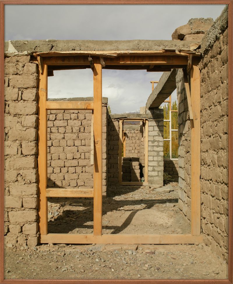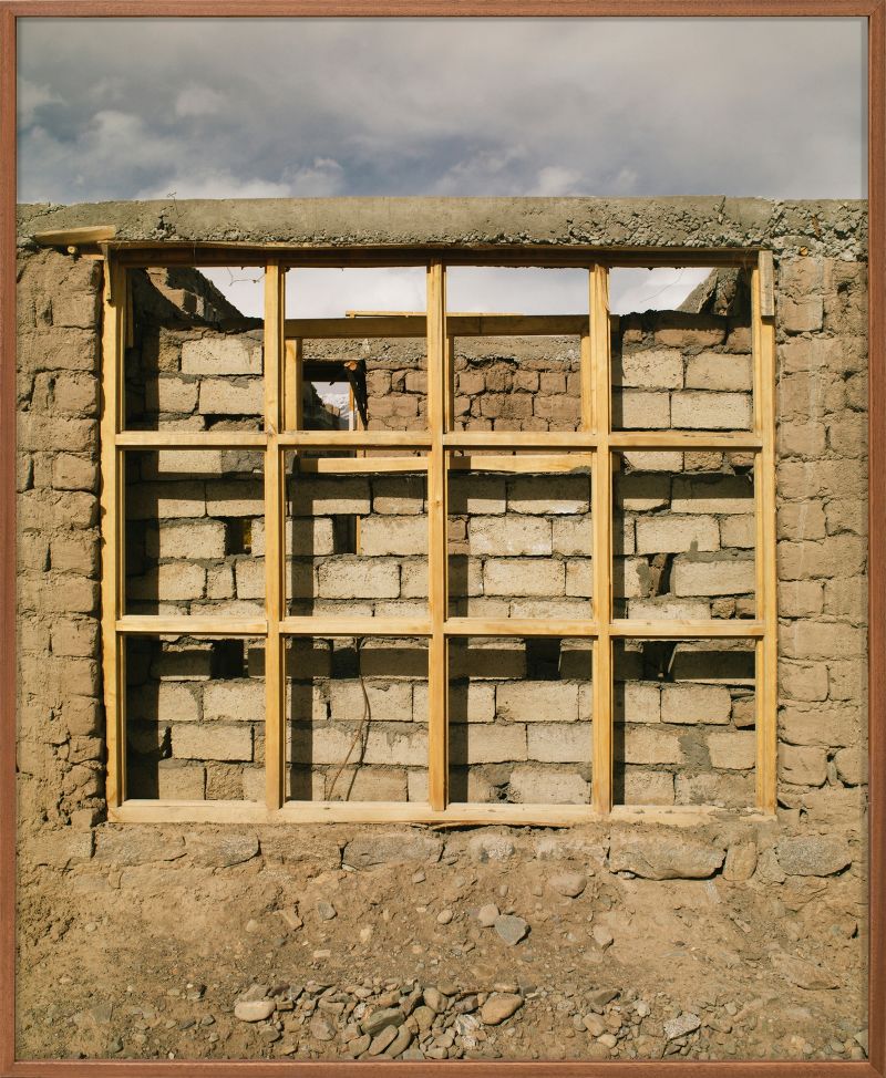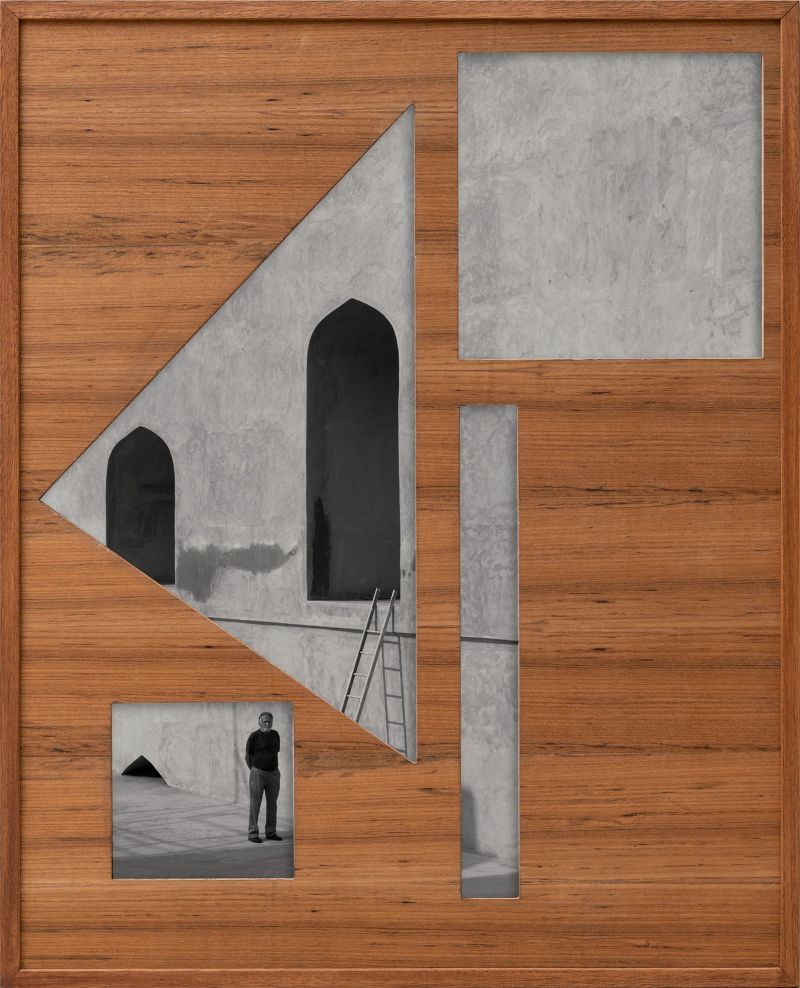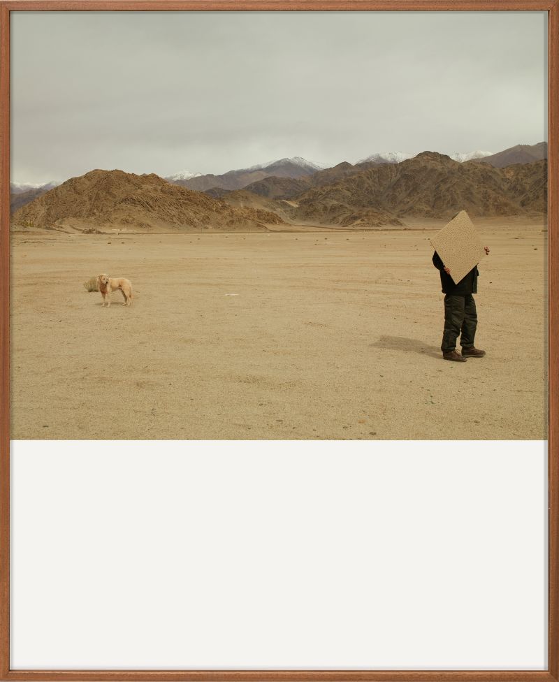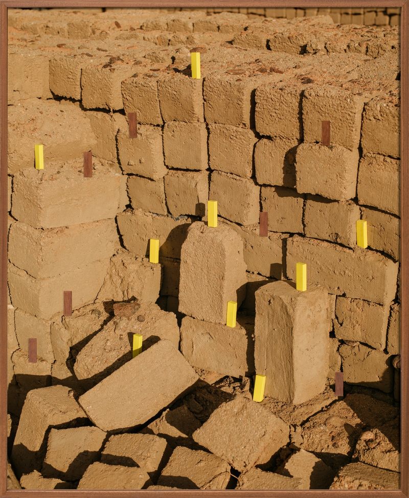 In Sikka’s imagery, we see objects and arrangements that hint at construction. Rulers and stensils, an encounter with thorns, wooden window and door frames, yellow markers upon huge sandy bricks. (There’s nourishment of fruit and drink in the middle.) The slices of time and space call to mind Umberto Eco’s belief that what we become is formed from the “little scraps of wisdom” that fathers teach us unwittingly and indirectly.
