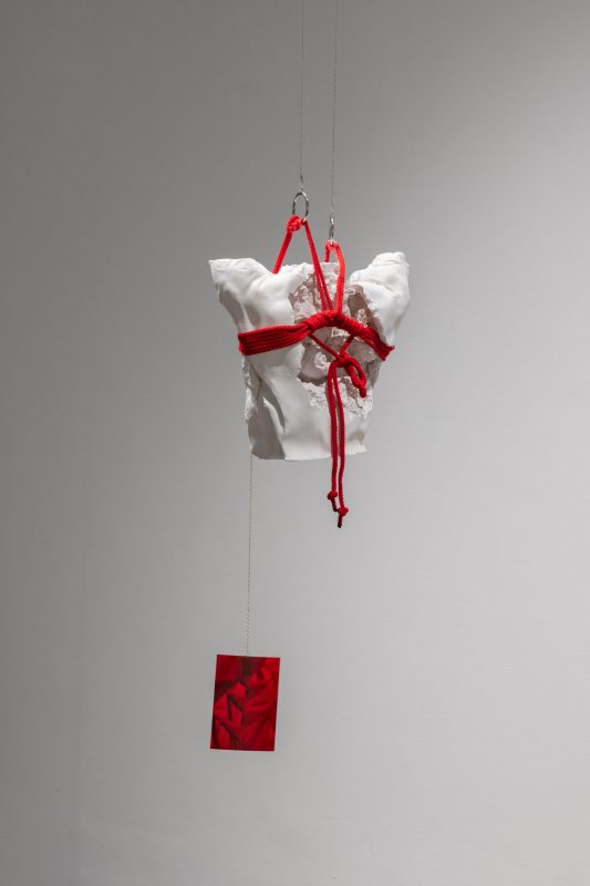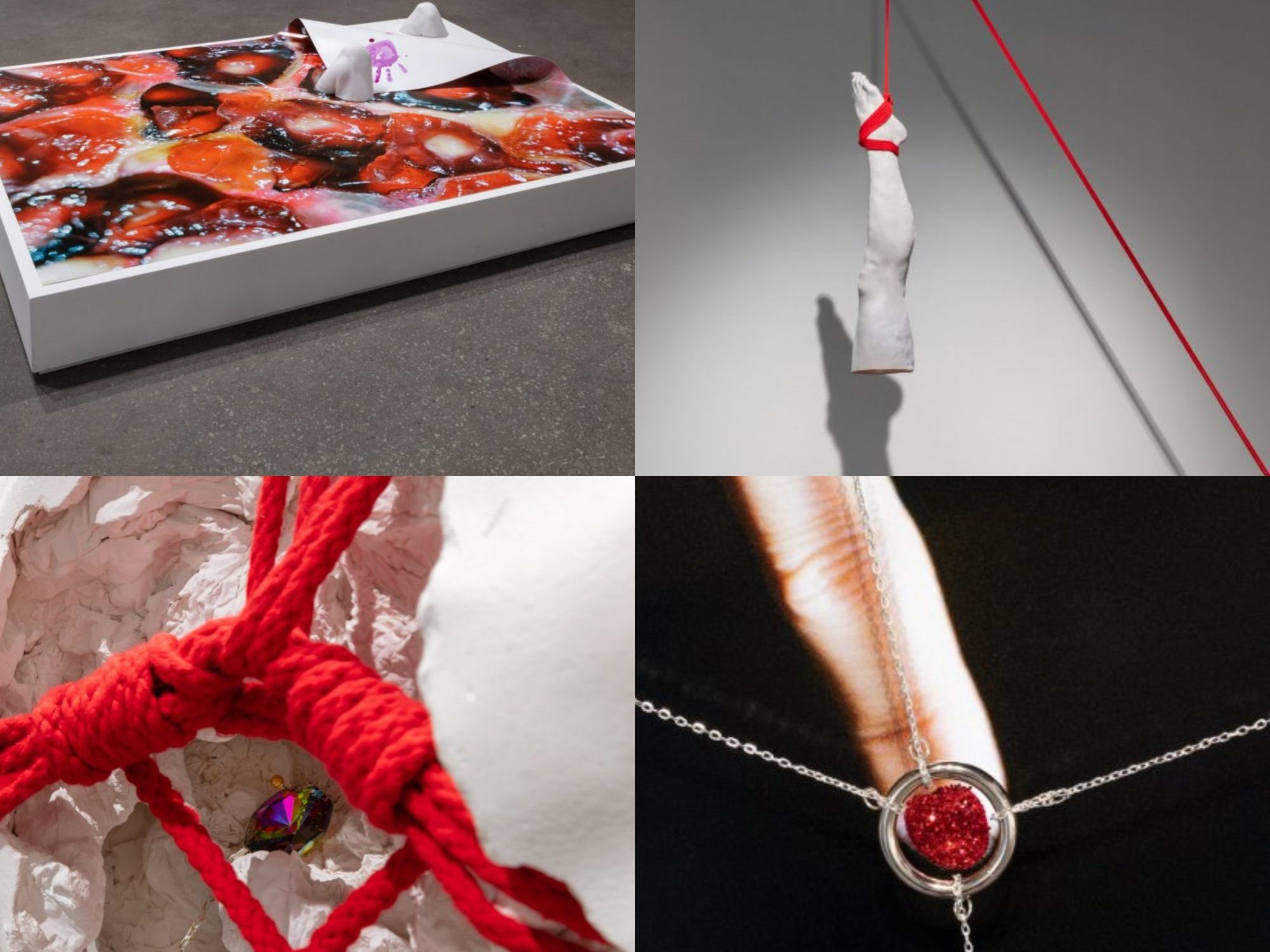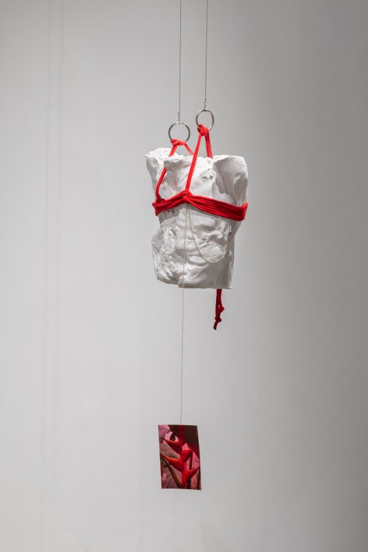 “Soft Spot” shows the tender print of a palm below a photo of cardiac anatomy, hinting an initial impression of one person upon another. A white torso is caught within tight red ropes in “Sub Rosa”, indicating the pain, impatience, a certain tightness and suffocation that come with desire. But chains hold and keep the torso from falling off—perhaps the link of love, no matter how distressing, is precisely what prevents decline? In “Star-Crossed”, two legs point to different directions, as if bound for different destinies—but remain connected by red ropes—seemingly incapable of being too independent, in the end.