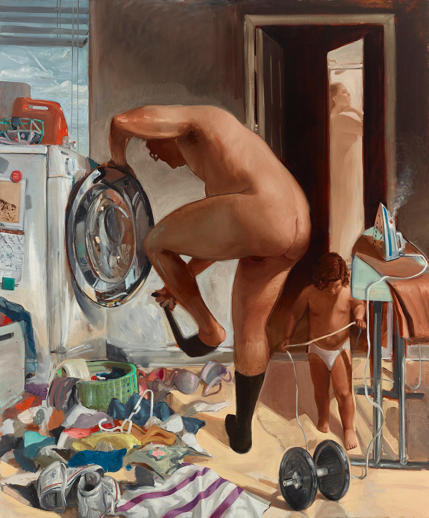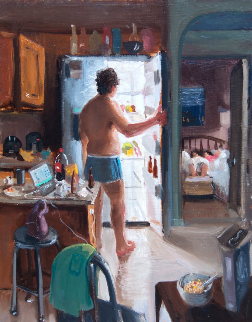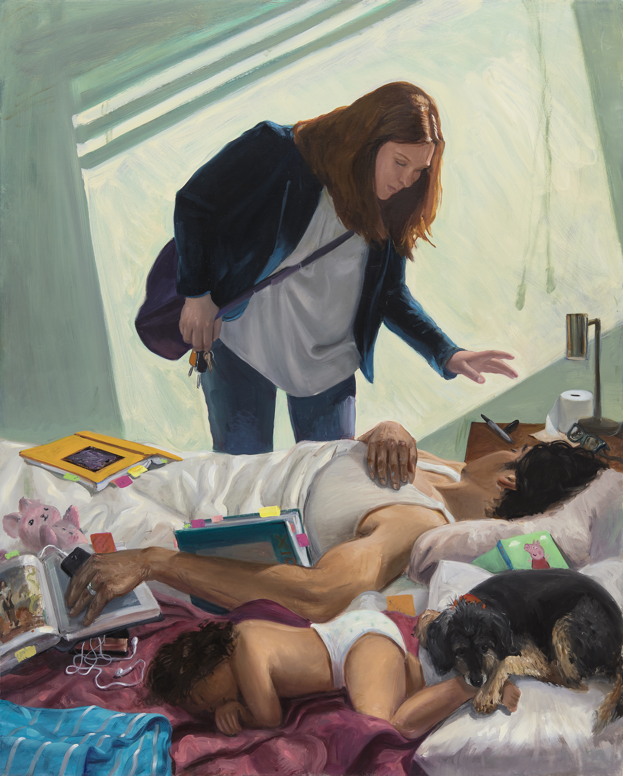 Mom, with keys in her hands, is ready to rush to work while dad and baby are still asleep. At night, when mom and baby are resting in another room, a hungry dad opens the fridge, Coke bottle, cereal bowl around. A canine couple copulate somewhere in a background, a bird drinks from a pool upon which sails a paper boat. A bra lies near the sofa. Inspiring affection, these scenes—that present the thrill, pressures, weight and chaotic splendour of modern urban family life—mirror the very existence of the viewer even though they are derived from the artist’s personal experiences.