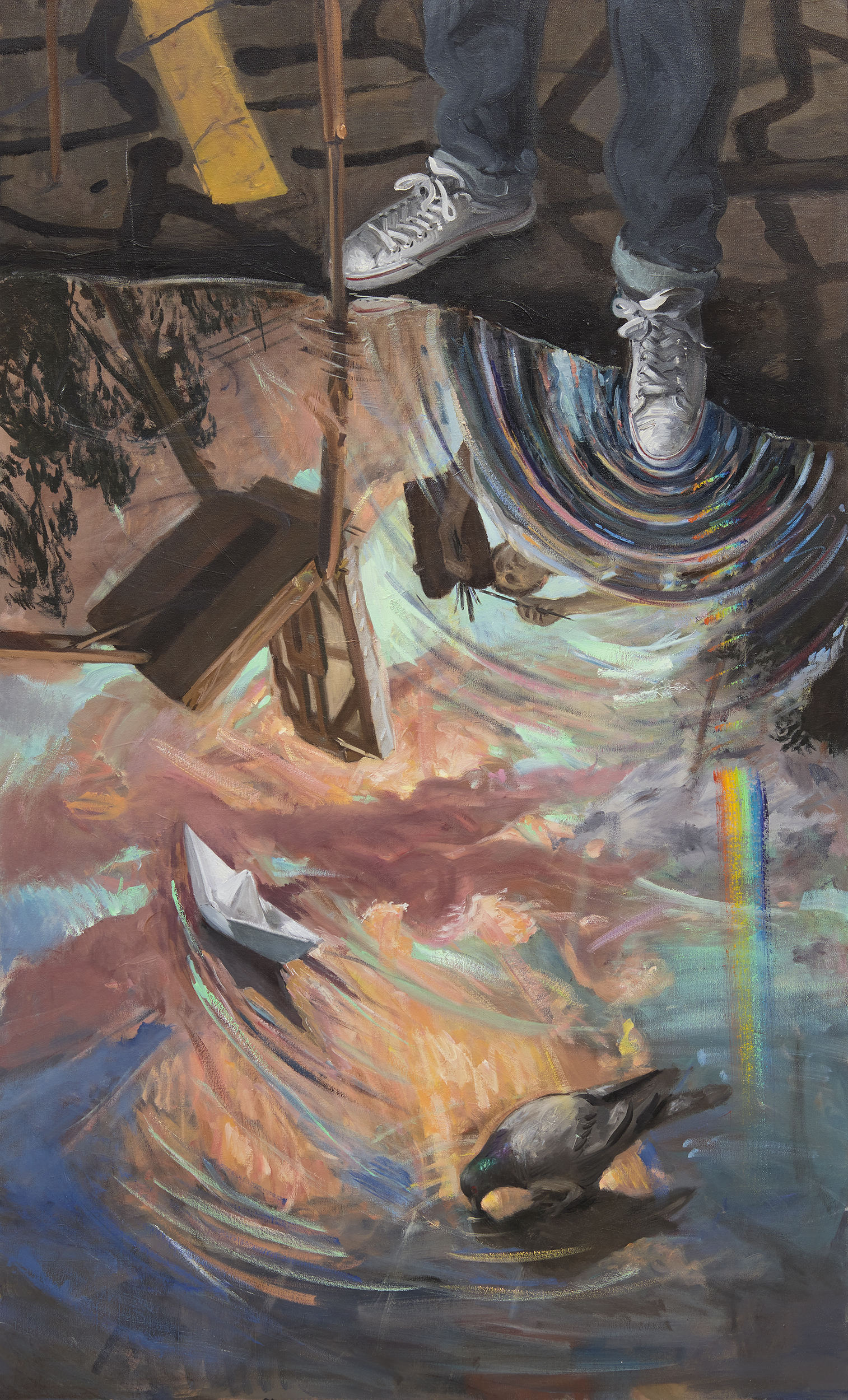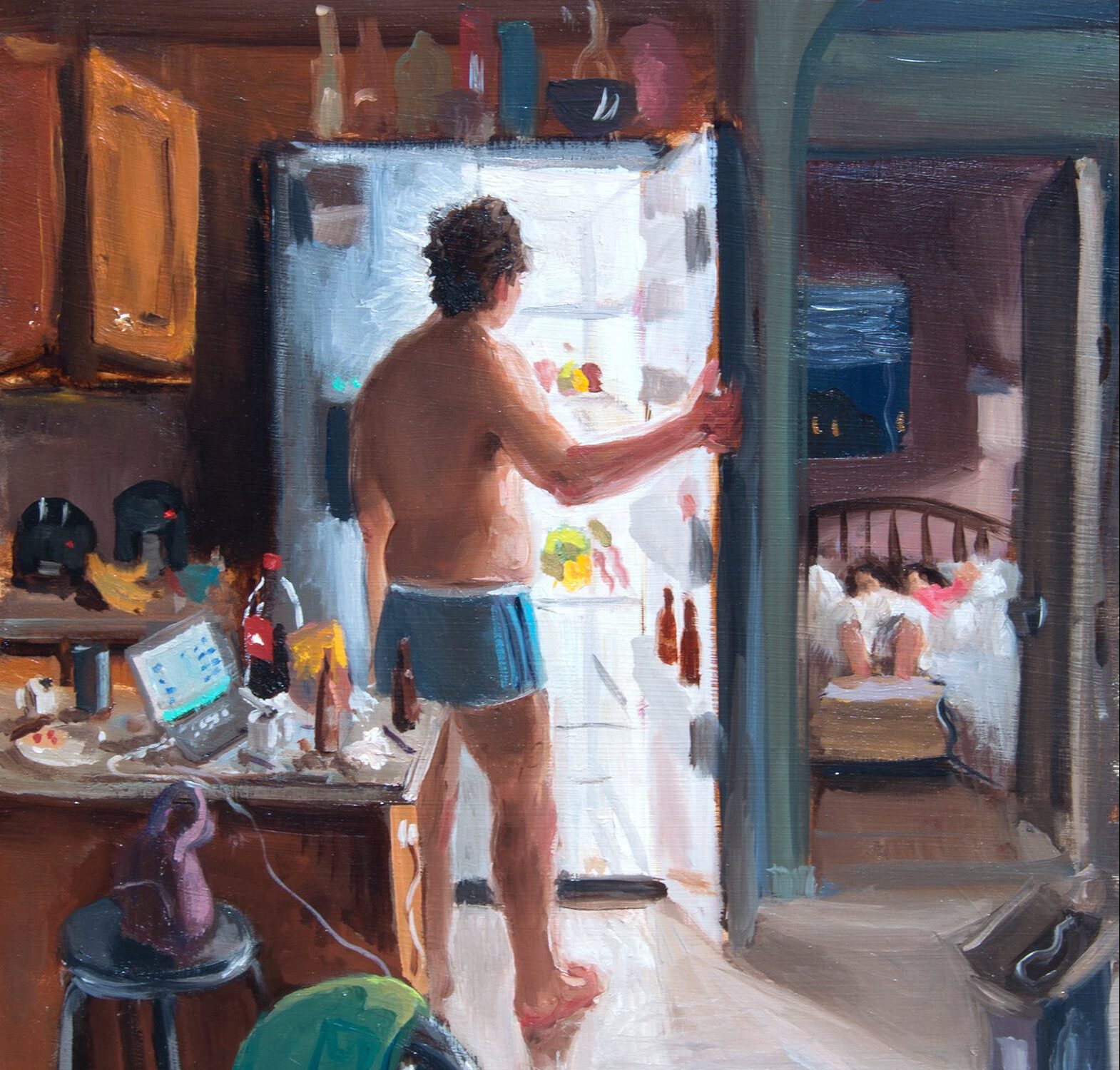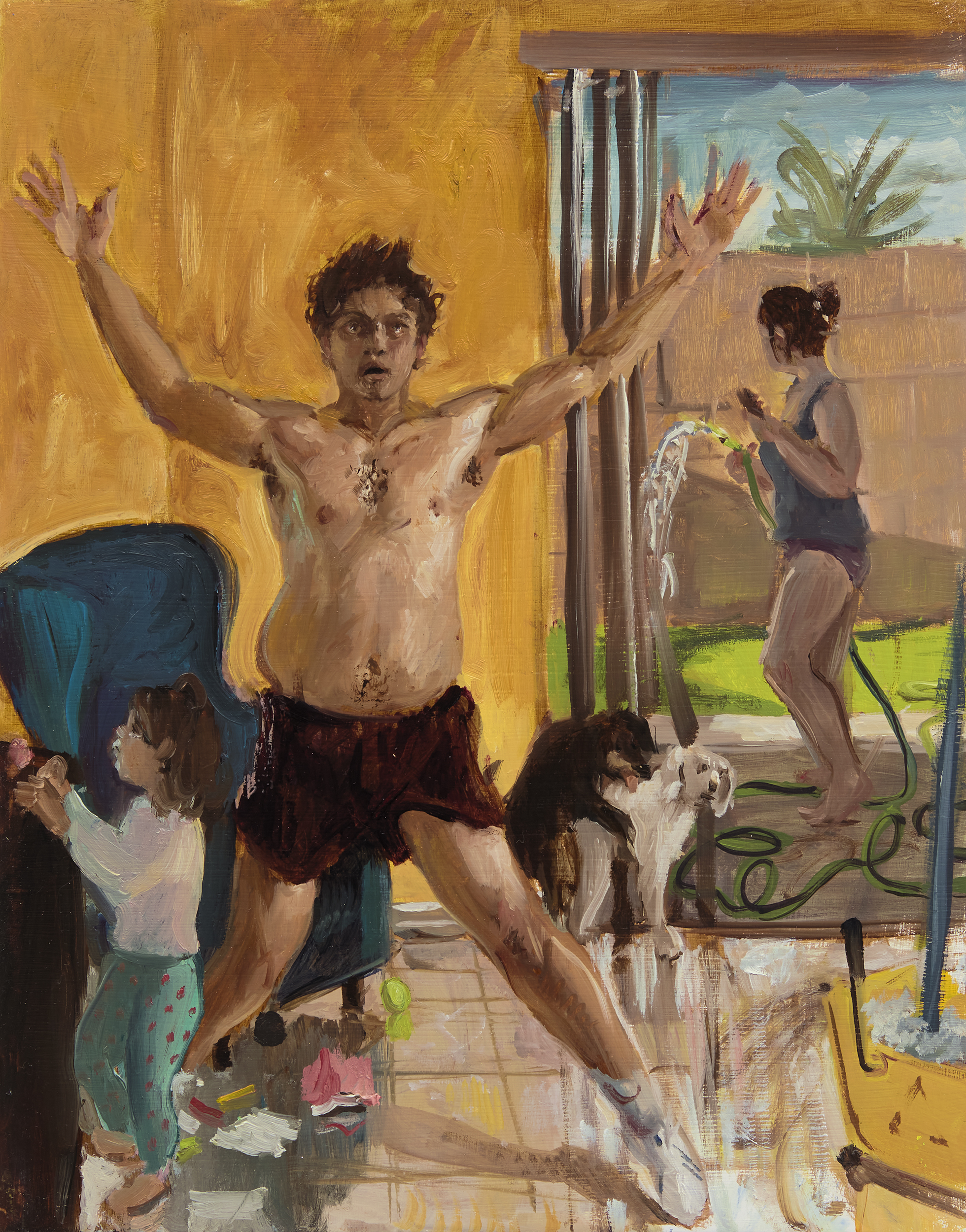 Mom, with keys in her hands, is ready to rush to work while dad and baby are still asleep. At night, when mom and baby are resting in another room, a hungry dad opens the fridge, Coke bottle, cereal bowl around. A canine couple copulate somewhere in a background, a bird drinks from a pool upon which sails a paper boat. A bra lies near the sofa. Inspiring affection, these scenes—that present the thrill, pressures, weight and chaotic splendour of modern urban family life—mirror the very existence of the viewer even though they are derived from the artist’s personal experiences.