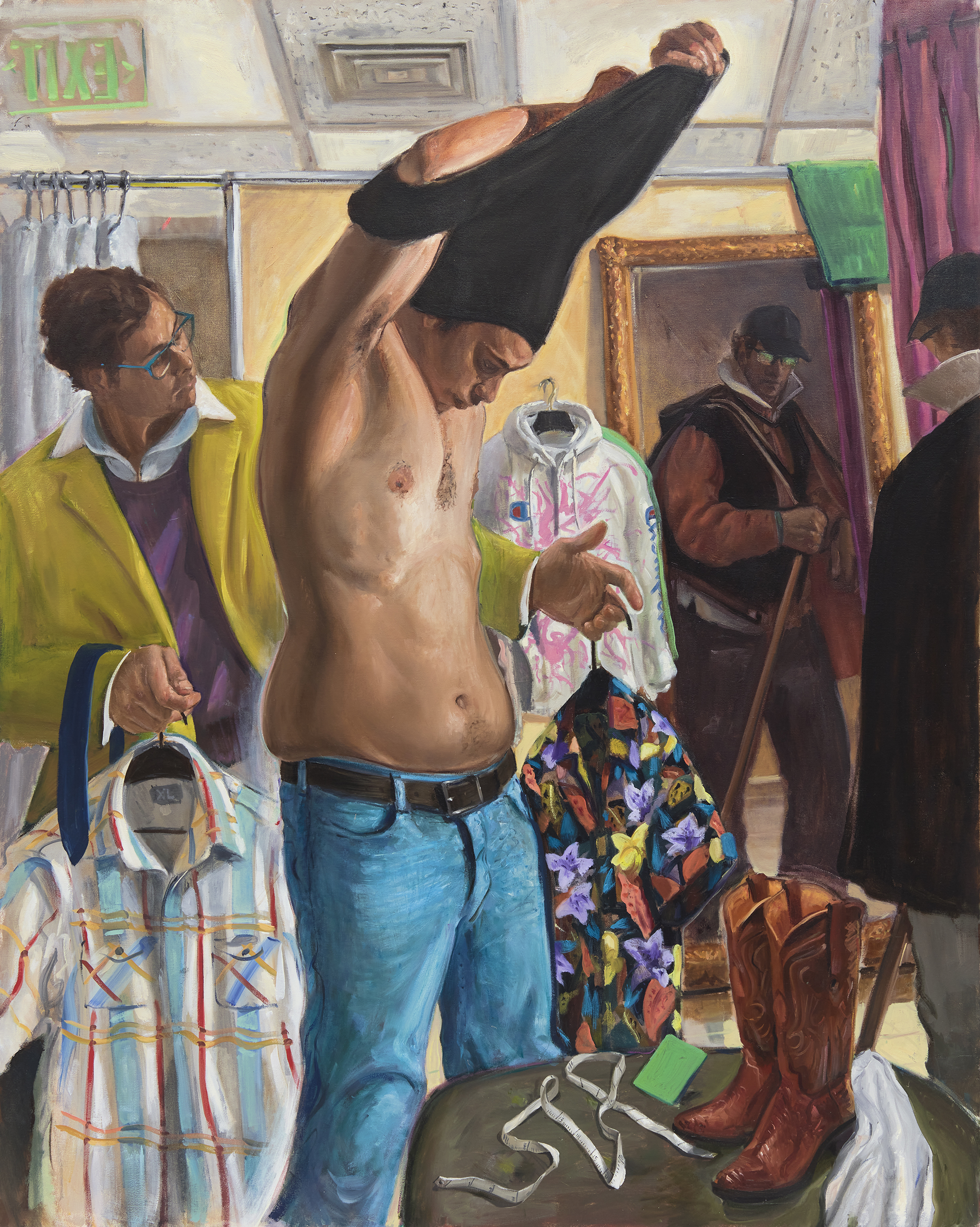 “Thus, I paint scenes such as morning routines, fitting rooms, domestic activities and other seemingly unimportant moments, that when suspended, reveal hidden questions about the human condition. I often depict myself in these situations as a form of self-portraiture and display of vulnerability. My work also reflects my own internal crisis of masculinity.”