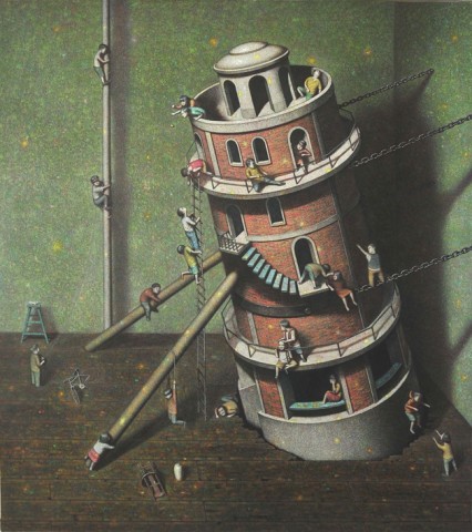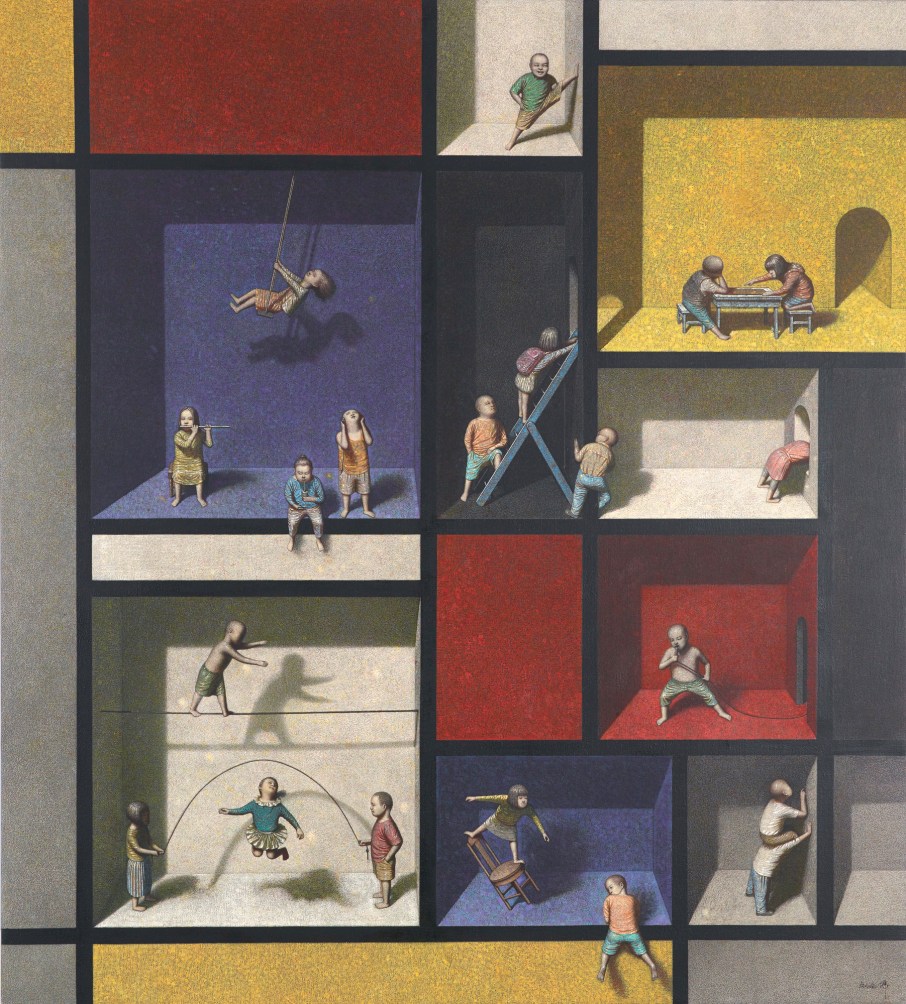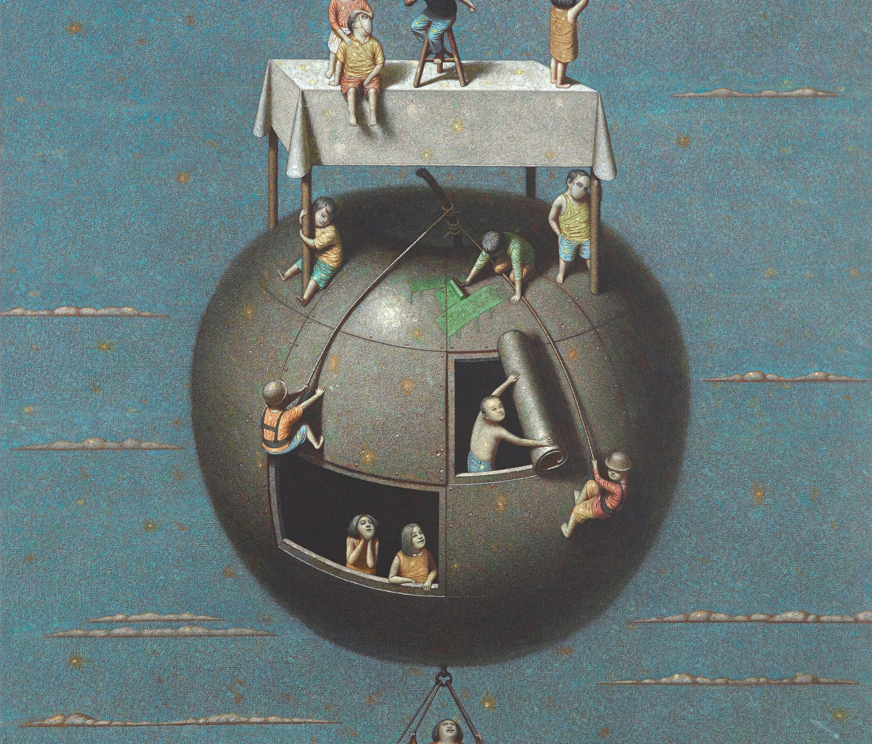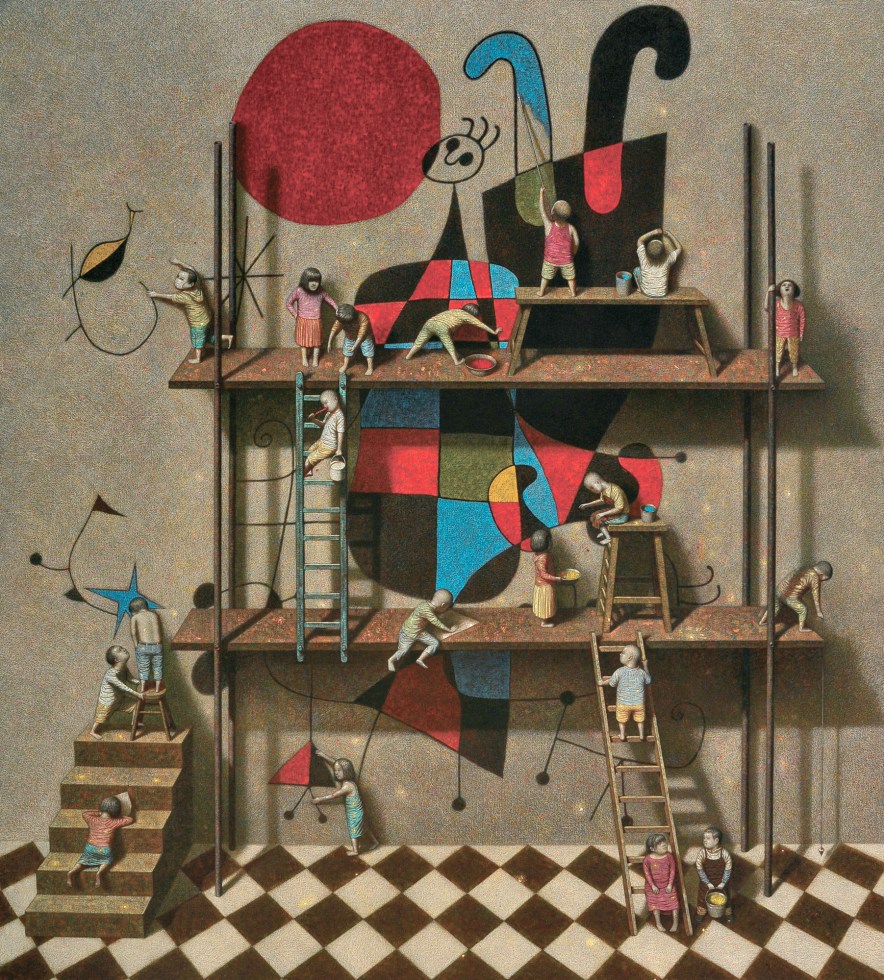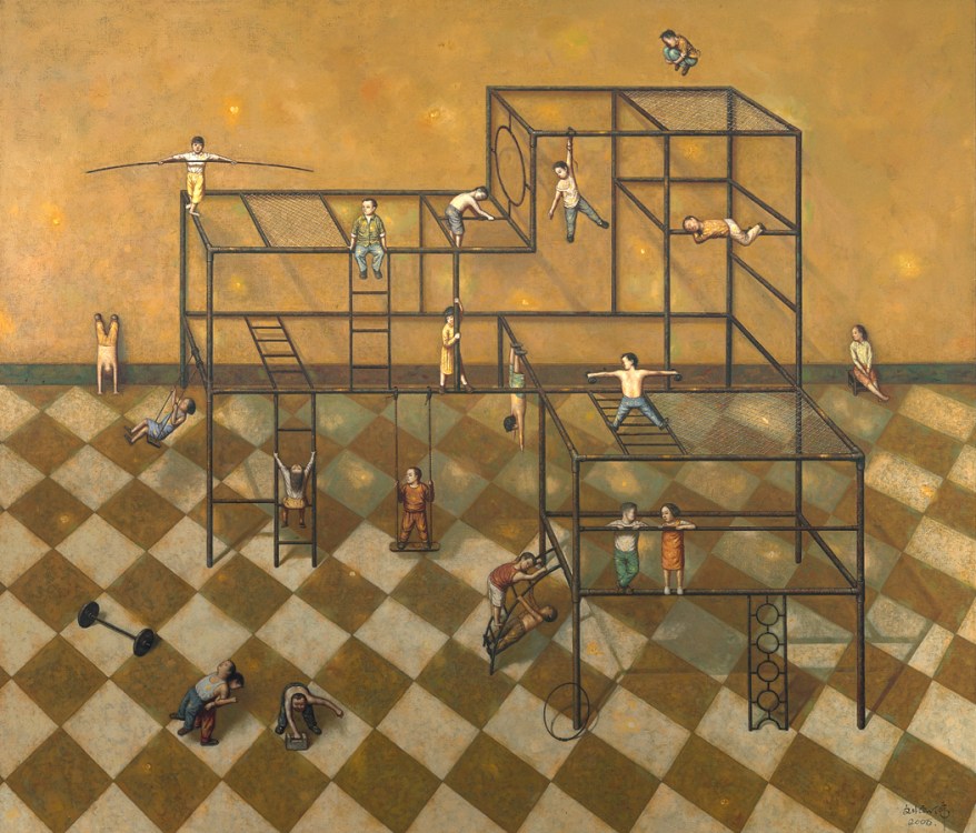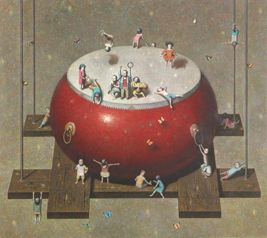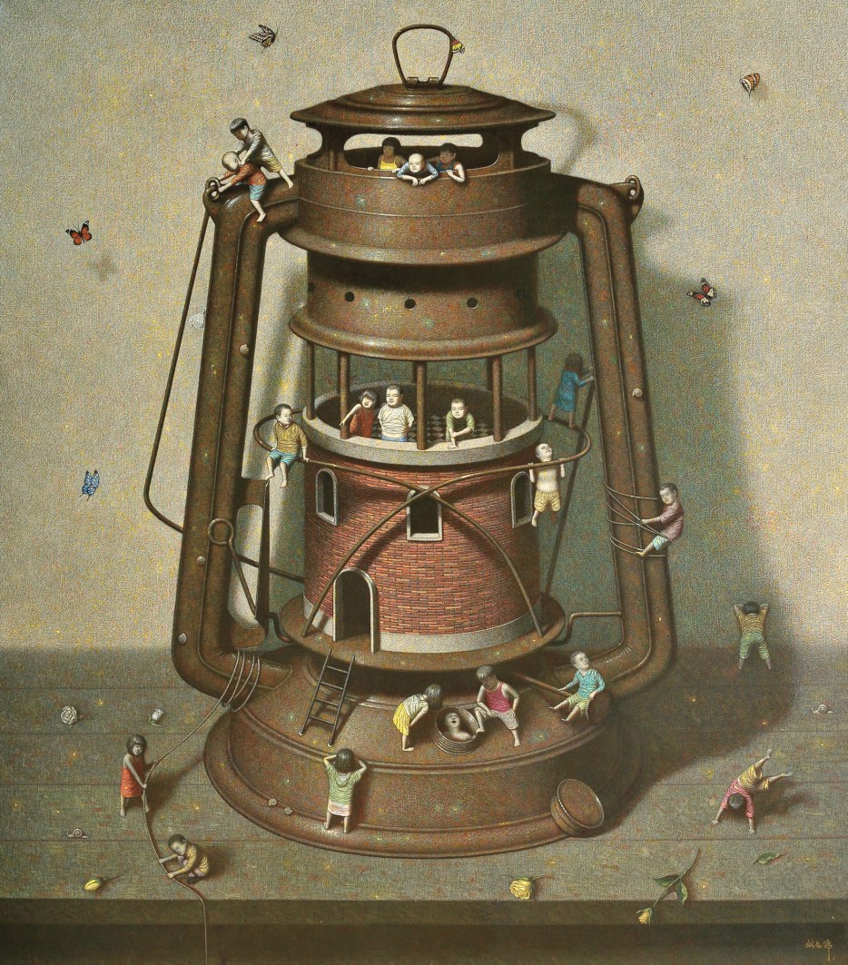 The artist’s Hong Kong gallery Kwai Fung Hin states: “The paintings of Liu Hong Wei always look like scenes from a dream. In his works, people and objects of the real world are put into fabrications, not in accordance with the norms. Yet the depictions are fine and delicate, every scene on the canvas is fascinatingly alive. Therefore, he is drawing a world that is both distant from and close to us, in which familiar characters are playing absurd stories in a bizarre setting. His vision liberates our heart, changes our perspective and proposes infinite freedom from the known.