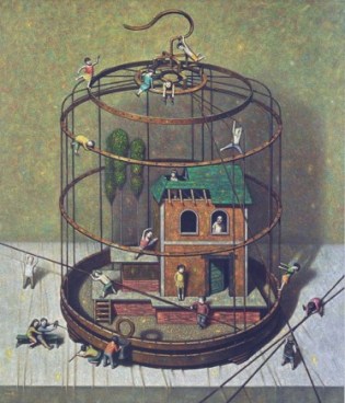As a means of escape in his solitary environment, he fashioned a fantasy world, which would become the subject of his artistic career as an adult. Children are his main motif, shown engaging in different kinds of activities.