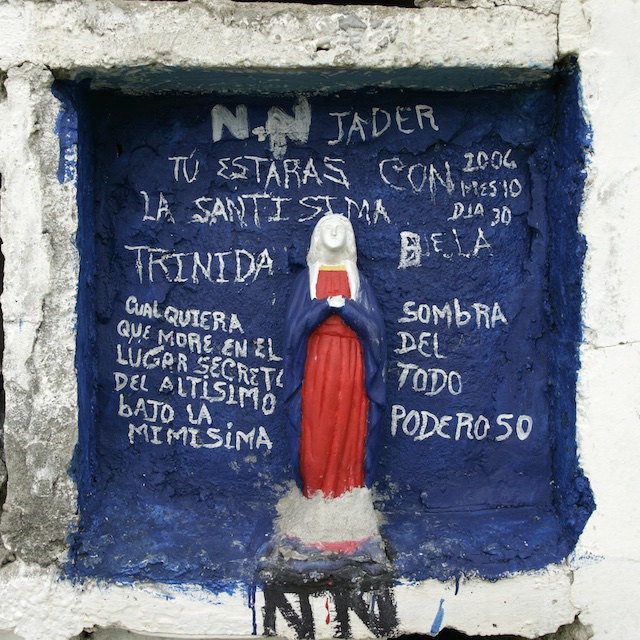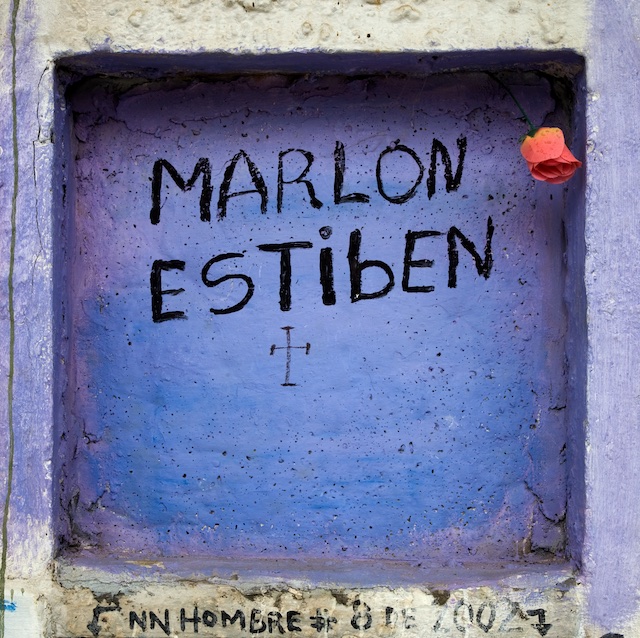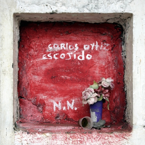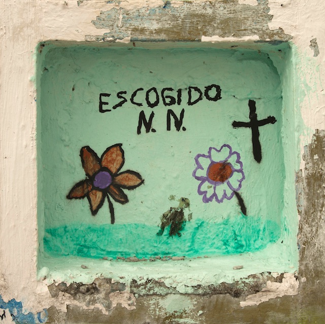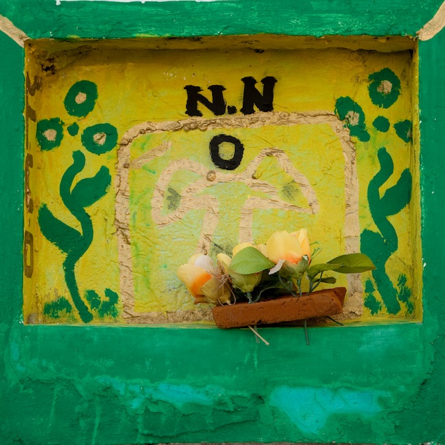 In 2006, after his first visit to Puerto Berrío, a town on the banks of the Magdalena River, Echavarría set up the foundation Puntos de Encuentro to give scholarships to students from rural areas, invisible victims of the drug war. Through 2013, he has taken multiple journeys to document a cemetery in the town. Within the cemetery, a particularly colourful mausoleum stands apart from the others. The tombs are marked with the letters NN: Ningún Nombre—No Name.
