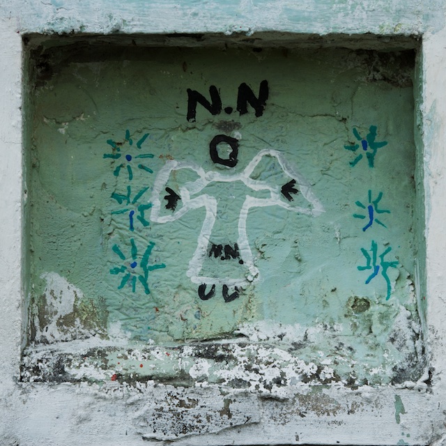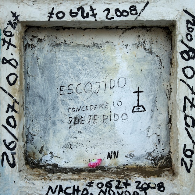 The people of Puerto Berrío save the nameless bodies from the waters of the Magdalena and bury them in the cemetery. Then they perform a second ritual. A NN can be “escogido”—chosen—by someone who agrees to take care of their tomb, to pray for their soul, in exchange for favours from the dead. The blessed one adopts the NN, decorates the tomb with flowers and often a marble slate saying, “Thank you NN for the favour received.” Some caretakers even name their NN, often granting them their own family name, inscribing their new name on the marble.