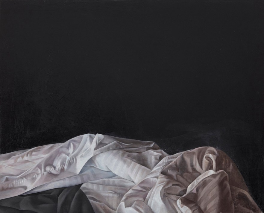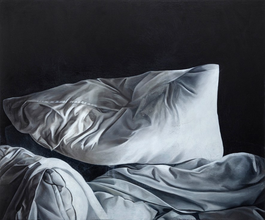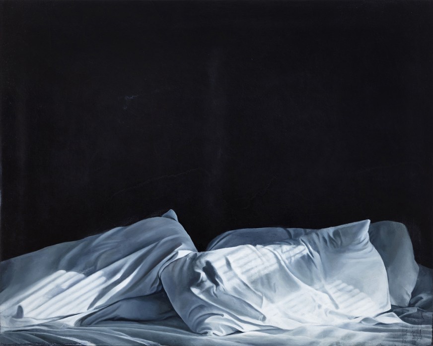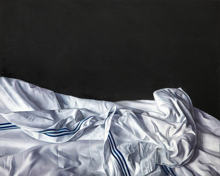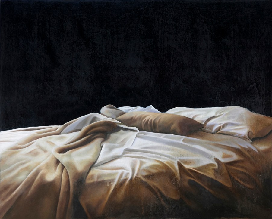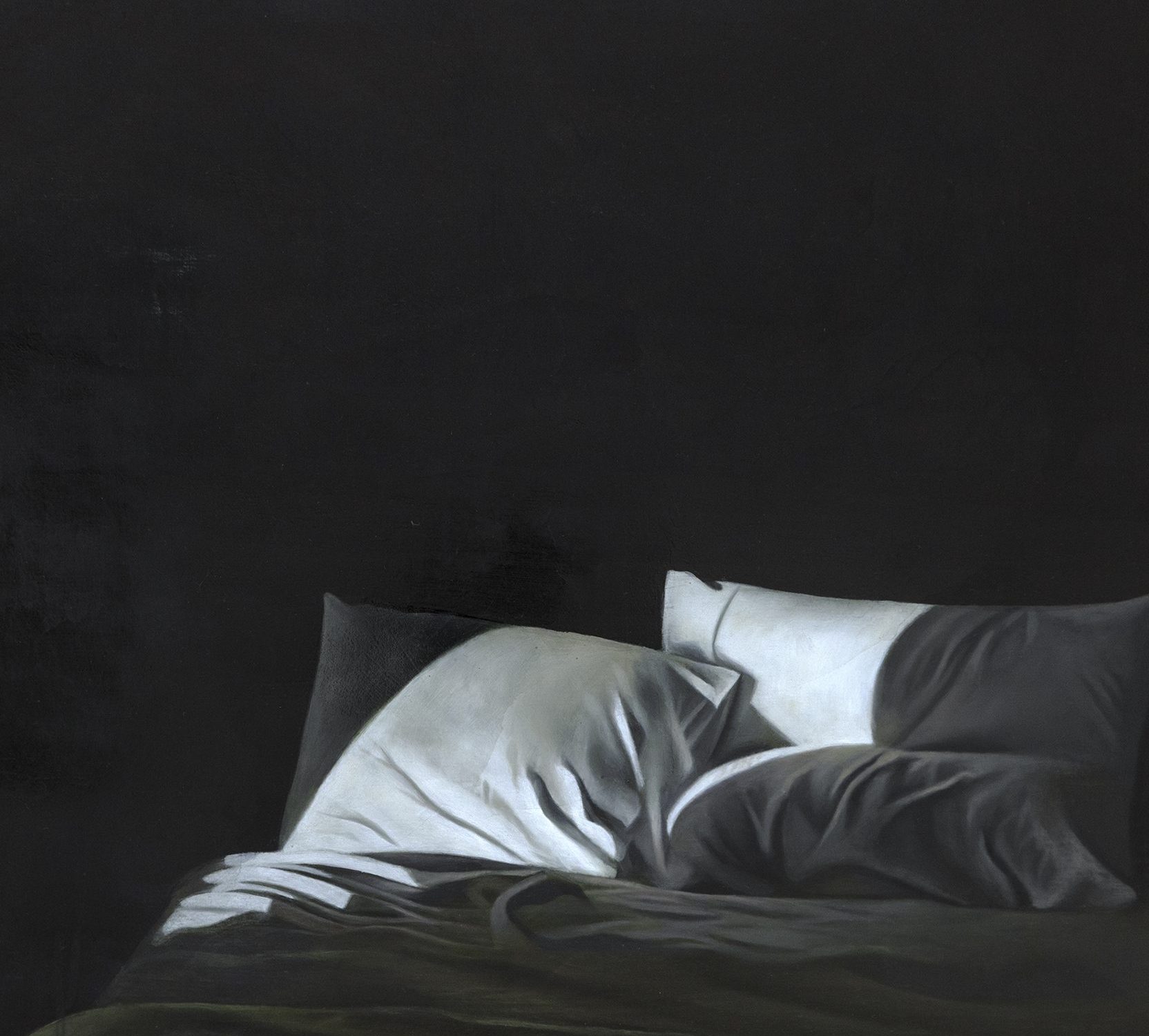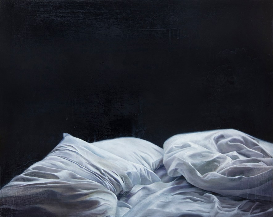“Source material for this work are photographs I have both taken and found, and the intimate size of the paintings references the intimate nature of the subject matter. The backgrounds of the paintings are repeatedly painted and sanded, to create a frame and backdrop for the bedding that is flat, yet rough with work and time. The bedding itself is seen from different perspectives, but still indicates a scene of desolation and despair.