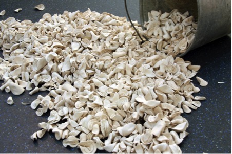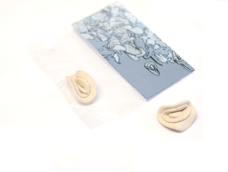 Reminiscent of shells and flowers the ceramic pieces symbolise cut and discarded female genitals. No two ceramic pieces are the same. No two female genitals are the same. They are presented pouring out of an old bucket and intermingled with hair and nail trimmings. These body parts are all cut to improve appearance, they are perceived to have no value and are consequently discarded.