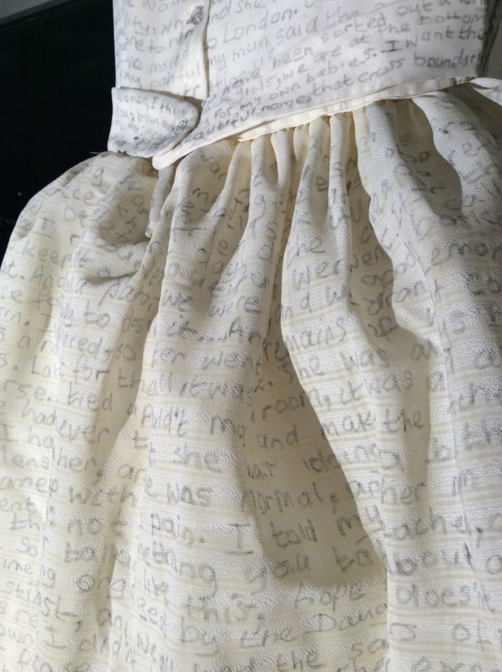 The text from Felicity’s monologue has been transposed into a different medium to create a 3D artwork. Written onto a child’s dress, ingrained using a pencil, it is intended to be both direct and thought provoking. The piece has been created in response to the line, ‘they gave us presents, nothing too special, these girly, puffy dresses, because the dresses got spoilt with all the blood afterwards’. A new dress, for most little girls is usually something to cherish, to feel pretty in, play at being a princess in. The words tell a different story. For the purpose of this 3D artwork and artistic license, some text is repeated or emphasised, although none of the words have been changed.