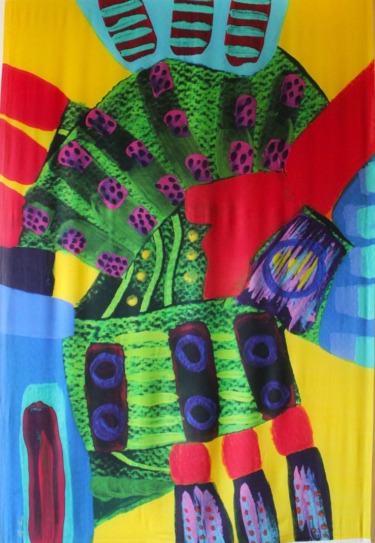 “The Eden Garden” wall hanging is part of a project within which Capouskova explores the meaning of soft values such as attachments, memories and emotions. The collection consists of several original paintings that were digitally transferred onto pure silk with the aim to create pieces that radiate positivity and energy. The colours and shapes within the designs represent psychological journeying, capturing significant personal moments in an abstract way.