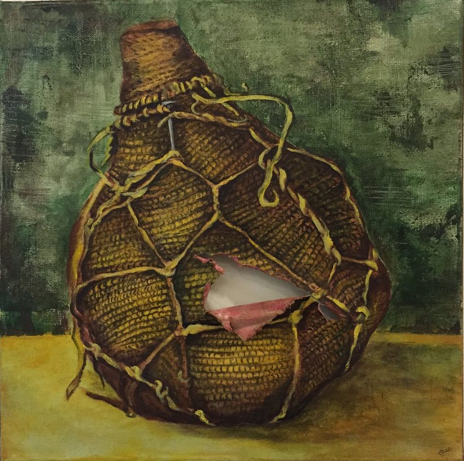 “Braided Vessel” shows an African water jar, a beautiful, handmade, and life-saving object. Colours are: natural, deep green, and sandy, desert-like yellow. When the painting was finished it was cut with a knife and left with visible puncture. So there is a real, sharp hole in the middle.