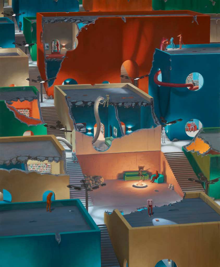 Through a cleverly deployed cast of anthropomorphic characters, the artist captured what it feels like to be human in a digitised society. He grasped the asphyxiating uncertainty, the shackling vanity and vapid materialism, laying it out for the viewer to engage with in a moment of catharsis, a moment that would turn a bleak subject matter into something lighter, more optimistic, even comforting. Wrapped within a sense of deafening alienation and staring into the abyss of a future that looks cancelled or unpromising, these characters make one think as they entertain. They are caught before mirrors, on holiday, seated within their pods, in moments of confusion or helplessness.