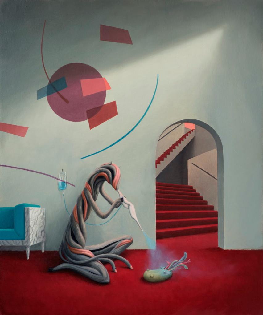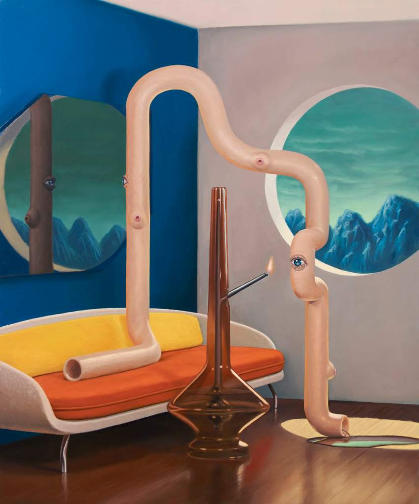 Unit London adds more: “In the likes of others, Olson’s characters are compound beings comprised of two or more distinct ideas: a pipe and a woman, a face and a tree, a fox and a snake. They come together in varying combinations and achieve differing degrees of familiarity. Their aim is to bridge what the artist perceives as an empathy deficit in contemporary society. Through being familiar but not personally recognisable these surreal, often rather grotesque creatures, allow the viewer to connect with the work in a more profound way—redolent of when we recognise relatable emotions in animals. The depersonalisation of these beings elicits a more personal response; the viewer can connect in the kind of emotive way that is commonly thought of as lacking in contemporary society.