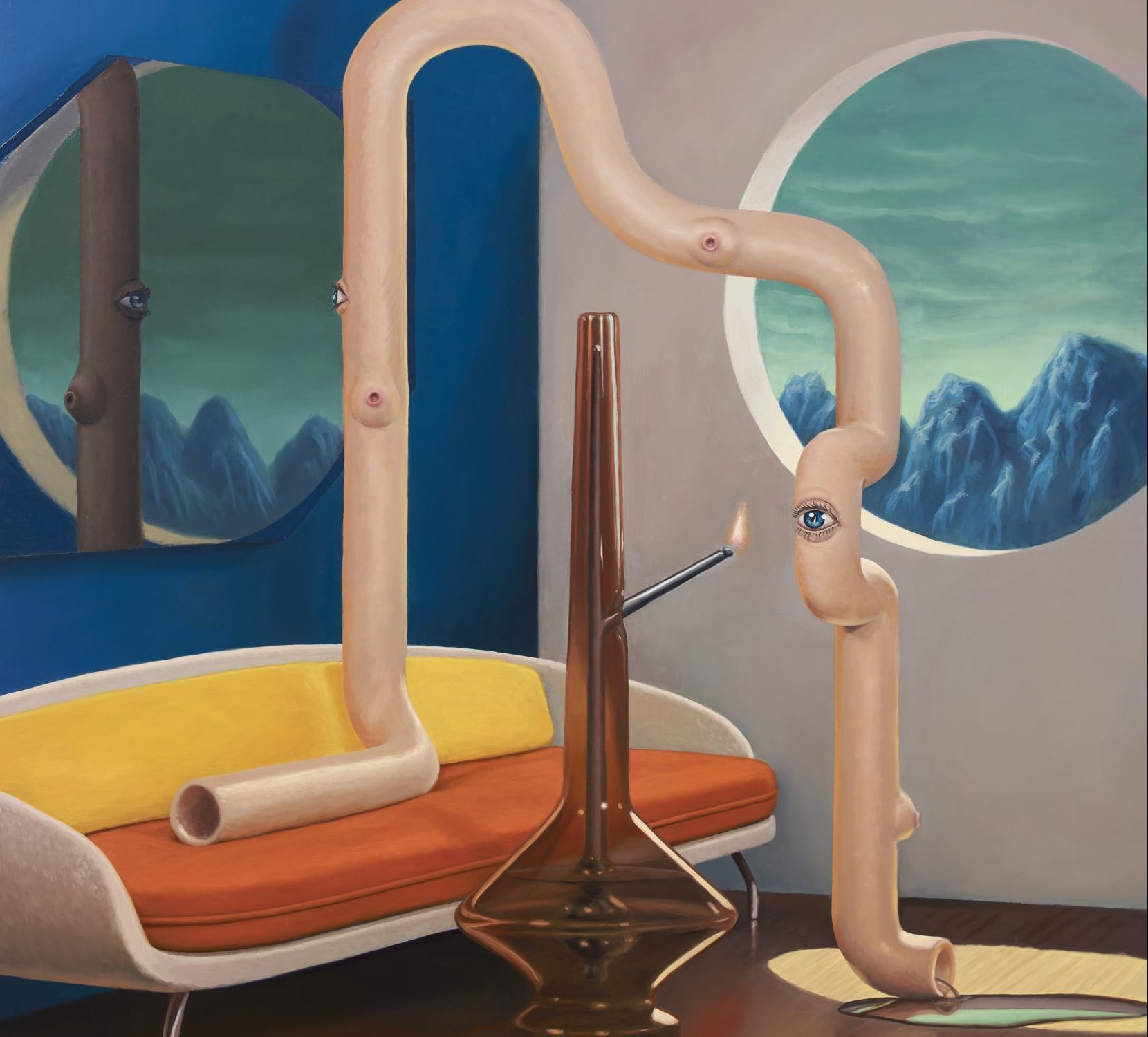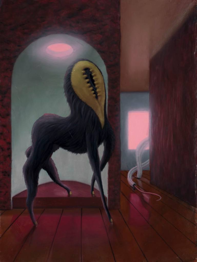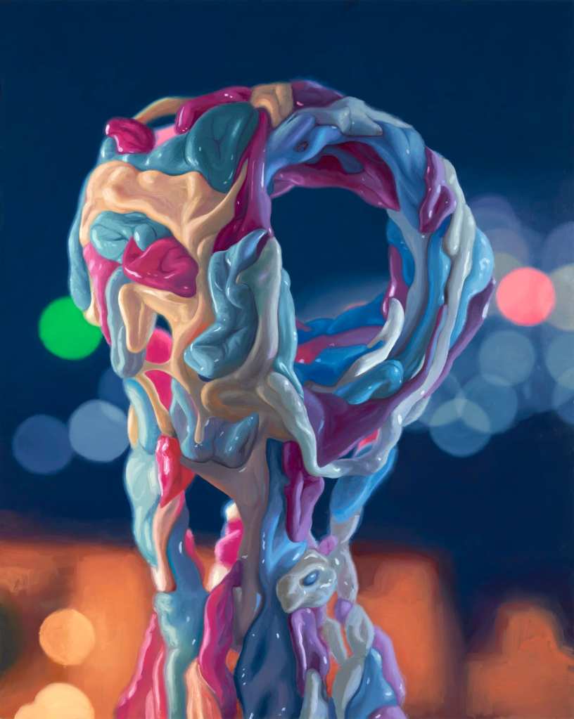 Brooklyn-based artist Jeremy Olson was earlier into kaleidoscopic portaits, in which he would place fragmentary parts over the face of his subject. Interestingly, over time, his practice took a very unusual turn. He now paints characters that are at once haunting and humorous—they are reduced, like remnants, with features that may be human or animal. Dental imagery takes on a flesh-like appearance while figures resembling knots of hair contort and writhe before the viewer.