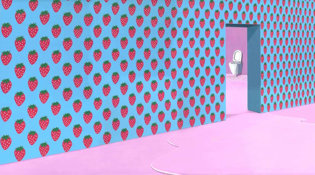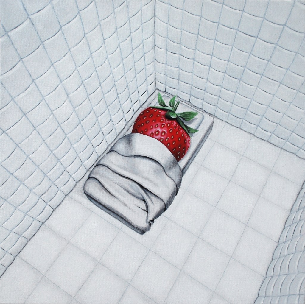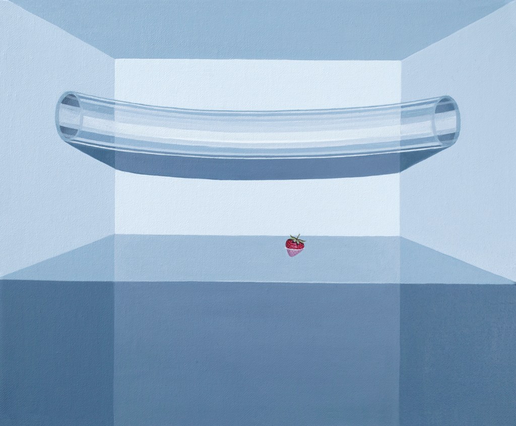 A strawberry, beautiful and breakable, is seen in seemingly cold white and blue interior spaces in the art of London-based artist Tijana Petrovic. Its reappearance makes you wonder what it might stand for. We see it on a bed, by the window, on a chair, in water, near something of an architectural maze. It seems like a human, either absorbed in the self or navigating environments that are too bland and inanimate to respond to its organic needs. At times, it is suspended in a heavy, tedious and endless present—between a comfortable past and unknowable future.