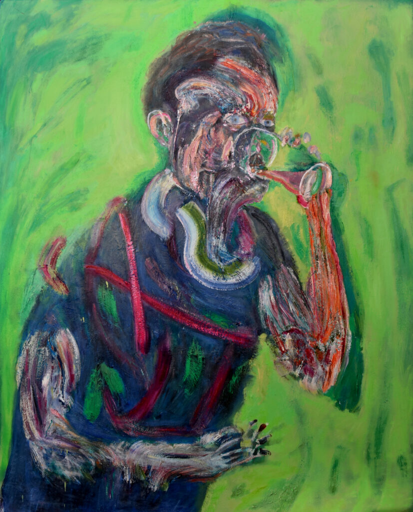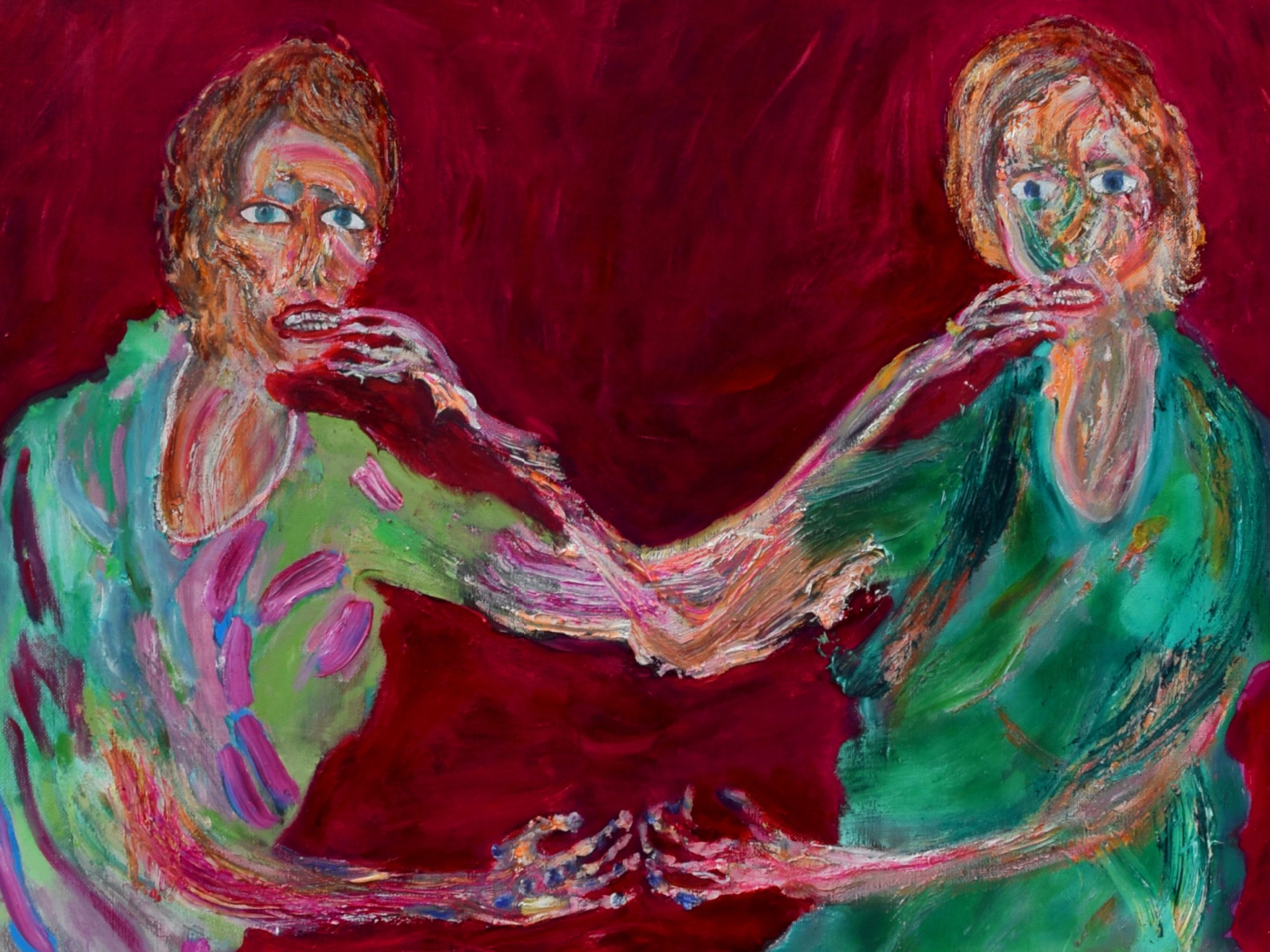 Alongside such imagery is delicate coexistence—a woman places a hand over the head of a dog, perhaps a couple is locked in an tender embrace, a child inches towards a fatherly figure. There’s an episode of mutual feeding at the table. We are broken and lonely creatures and yet forever open to giving and receiving, whatever the circumstance; our identity is tied to the bonds we are able to forge—these paintings seem to convey.