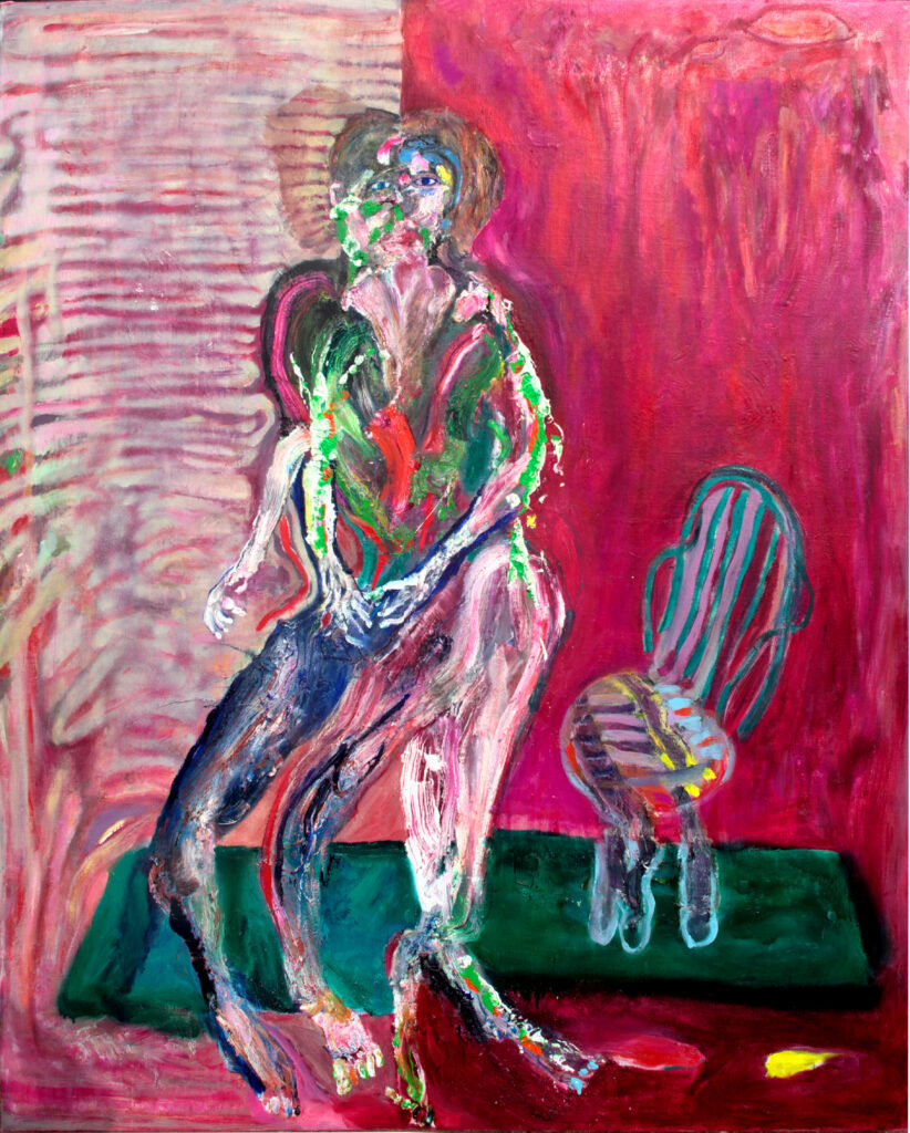 “Fragile Together” evokes both physical and emotional fragility, alienation and neurosis. A woman bites nails, a man loses himself in alcohol. Regular logic and sense have also been disrupted. Legs are detached from torso, a man weirdly looks at a car, two small human figures stand upon the shoulders of an abstracted personality on a chair.