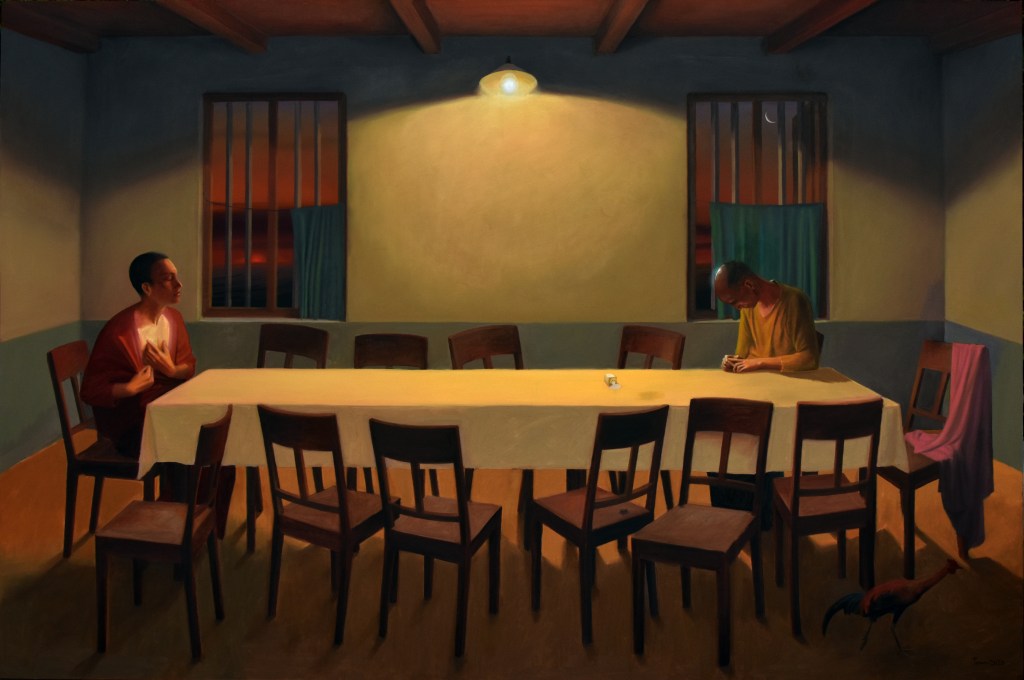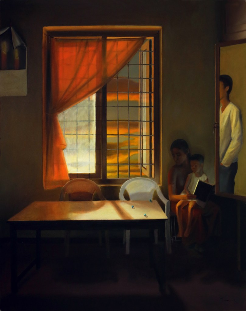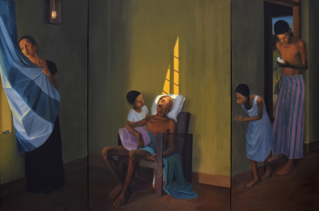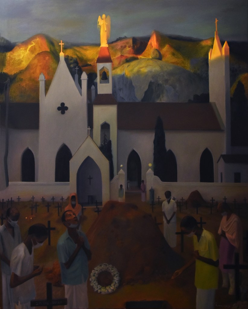 A child clinging to its parent, two figures at a long table engaged in a soulful conversation, a grandfather sleeping on a chair, a pandemic funeral next to a church, an indoor rehearsal for Palm Sunday—in the art of Indian painter Tom Vattakuzhy, scenes such as these are all lit, by the bulb or the moon or the sunset sky. His quotidian episodes are dense and deep, they communicate the splendour of being itself. Even when the characters are at rest, existence is active and energetic around them. The air is always heavy. The people have rich, mysterious inner lives. Also, inanimate things like curtains and toys make their presence known in an emphatic manner.