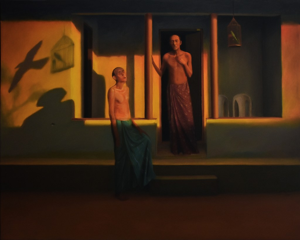 The artist, who hails from the town of Muvattupuzha, Kerala, in south India, says about his work: “If one asks me what I paint, I would shrink away as I do not have a straight answer. I do not work to fit myself into any political or ideological tag. I also do not consciously align myself with any ‘isms’ or trendy fashions in art. For me, art is a meditative solitary journey. I am concerned with exploring the psychological moods and feelings that I experience that do not have words to describe. At best, what I can say at this moment is that I am a painter of interiors—interiors of lives I see around, lives of the silenced, the marginalised and the alienated.”