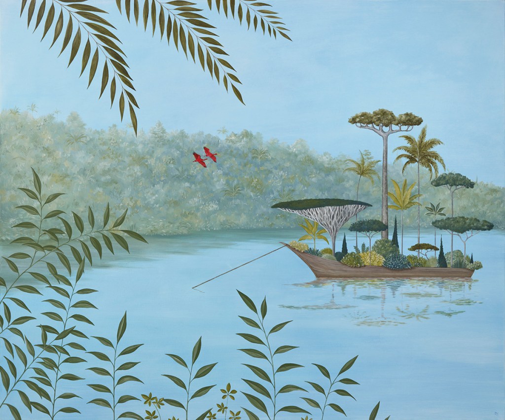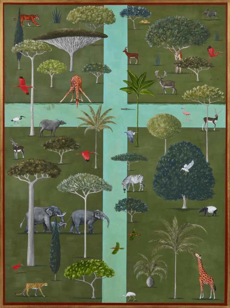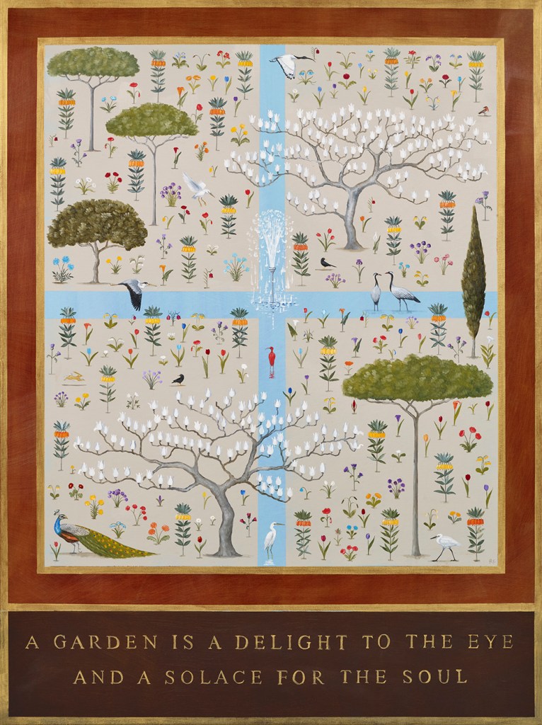 London-based artist Rebecca Campbell realises the universality of the garden in her delightful series “Gardeners’ World”, created in the first lockdown last year. She takes us on a journey across cultures and epochs, exploring our obsession with gardens in their myriad forms, from the original paradise of the Garden of Eden to the respite from modern life offered by rooftop urban gardens. These paintings capture the care and love with which gardens have been curated and cultivated throughout history.