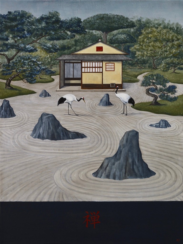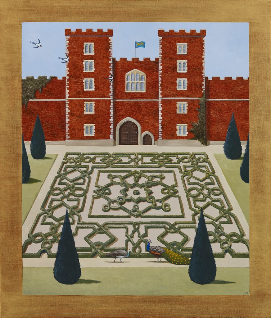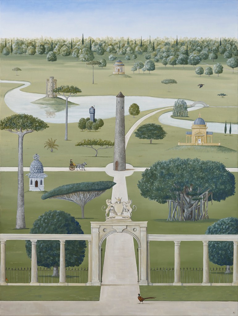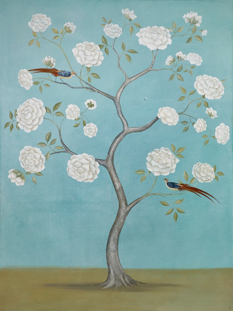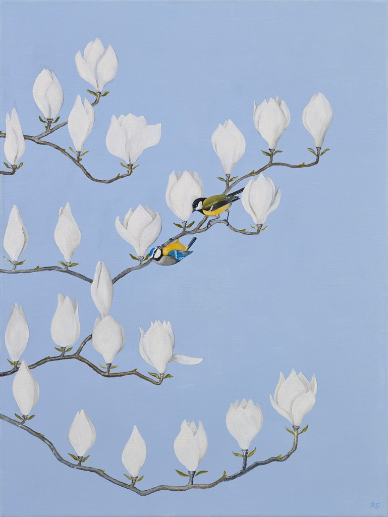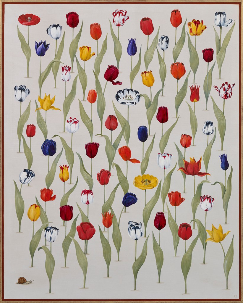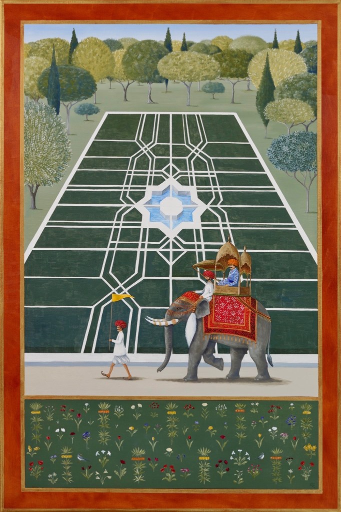 Rebecca writes on the collection: “The paintings include the original paradise of the Garden of Eden (The Eden Project); the meditative Japanese dry garden (Zen); the decorative Mughal garden (The Maharaja and the Mahoot): the Church cloisters with their practical medicinal and vegetable garden (Holy Order) to the very modern with gardens creating sanctuaries on top of skyscrapers (The Sky Is The Limit), amongst others. Gardening is a national obsession, it began with our ancestors, the plant hunters searching all four corners of our planet and brought back more and more exotic wonders (Botanist’s Bounty). The Dutch turned tulips into a commodity (Dutch Gold). It is hard not be believe that these or indeed rhododendrons and the magnificent magnolias haven’t always been here.”