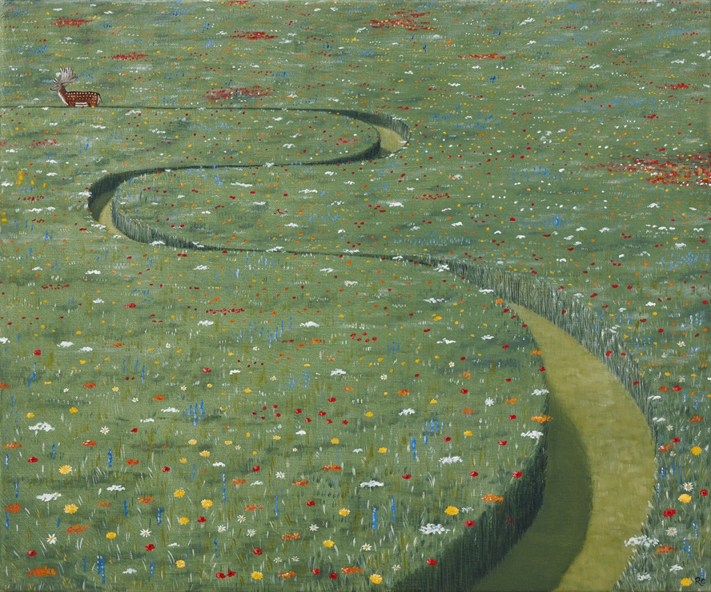 Trained in illustration at the City and Guilds of London Art School in the 80s, the artist exhibits great technical mastery. The architecture, flora and fauna are rendered with much thought. Red, yellow, purple—a variety of flowers open up before the viewer. Earthworms and hedgehogs, bees and butterflies—every creature has its rightful place in this world.