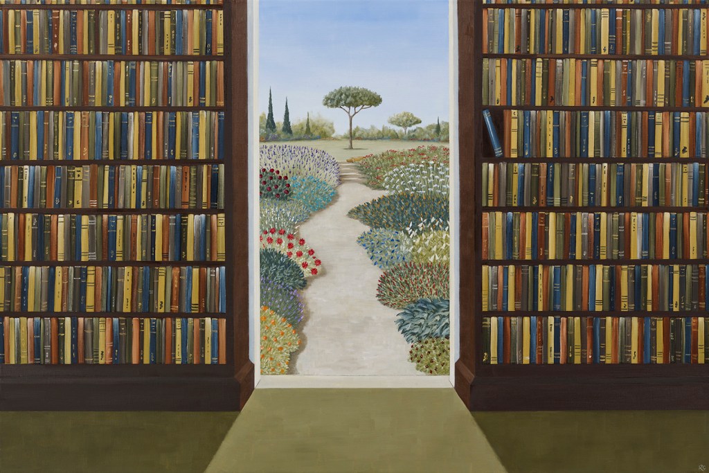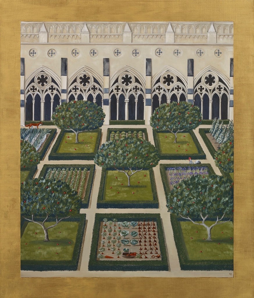 The artist quotes Audrey Hepburn: “To plant a garden is to believe in tomorrow.” The Indian writer Janice Pariat has elaborated on this virtue behind a garden: “A garden is in no hurry. It says the present is important, and dismisses our insistence on the forthcoming. Unwilling — because it can’t — to assuage our fears and uncertainties. Yet a garden is also always for the future. It coaxes us to nurture that most hardy of saplings: hope. That all will come to leaf and bloom at the right season, at the right time.” And that is precisely what Rebecca’s paintings are: contemplative spiritual exercises in hope, for herself and for us. With their beauty and bounty, gardens also provide solace and enhance our well-being during unprecedented times.
