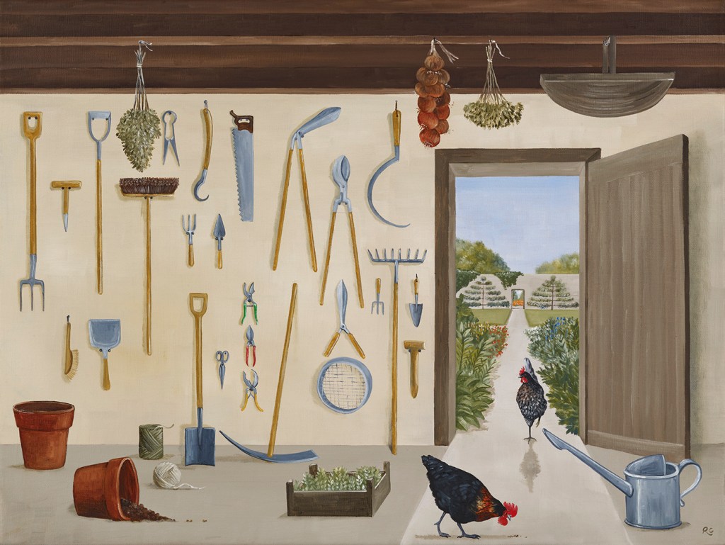 The craft and art of gardening too is celebrated. In “Tools Of The Trade”, we find a wall with saw and sickle, fork and pruners. The effort that goes into cultivation is looked upon with reverence and affection. Then, a parallel of sorts is drawn between learning and gardening. In “Life Is Complete”, a library opens onto rows of bushes leading on to trees.