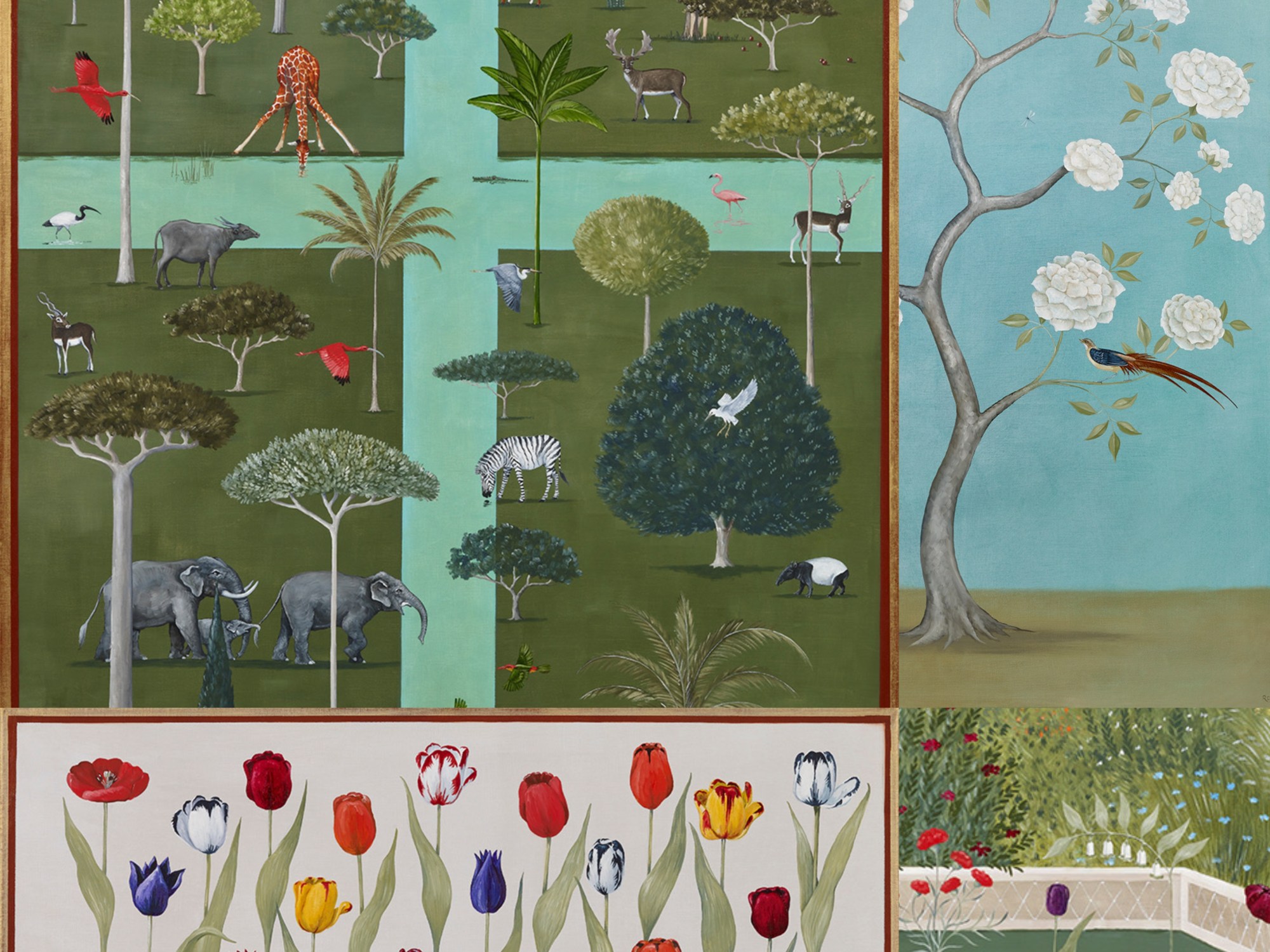 Rebecca writes on the collection: “The paintings include the original paradise of the Garden of Eden (The Eden Project); the meditative Japanese dry garden (Zen); the decorative Mughal garden (The Maharaja and the Mahoot): the Church cloisters with their practical medicinal and vegetable garden (Holy Order) to the very modern with gardens creating sanctuaries on top of skyscrapers (The Sky Is The Limit), amongst others. Gardening is a national obsession, it began with our ancestors, the plant hunters searching all four corners of our planet and brought back more and more exotic wonders (Botanist’s Bounty). The Dutch turned tulips into a commodity (Dutch Gold). It is hard not be believe that these or indeed rhododendrons and the magnificent magnolias haven’t always been here.”