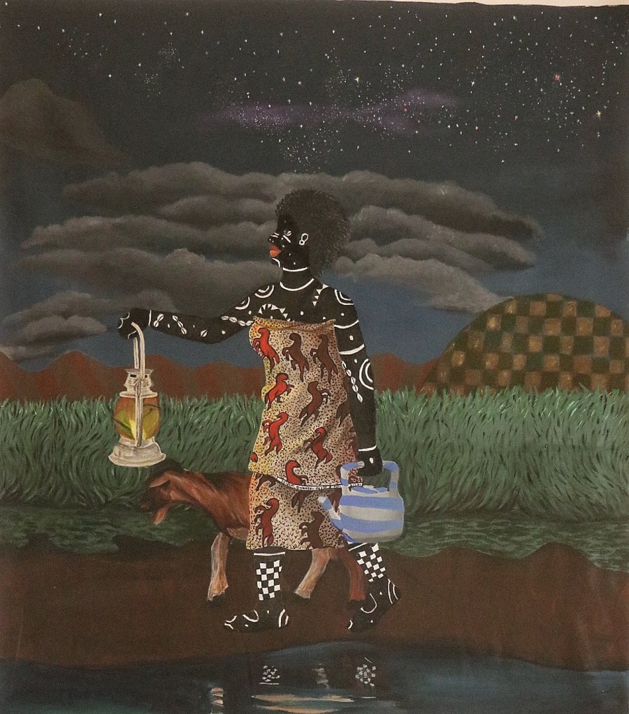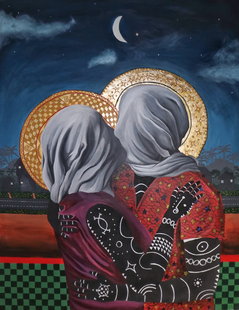 The indigenous iconography reflects and preserves heritage but also alludes to identity and psychology. Kelechi says about his black figures: “I chose to represent them that way because I’m scarred, emotionally. If you see someone on the road who has a big scar on his head that mark is part of him; it tells a story about that person. Tribal marks in African tell a lot about a person’s identity. That’s why I started marking my subjects. I’m symbolically telling you something about them. Along the way, I also started using the marks aesthetically, for what they add to the overall image.”