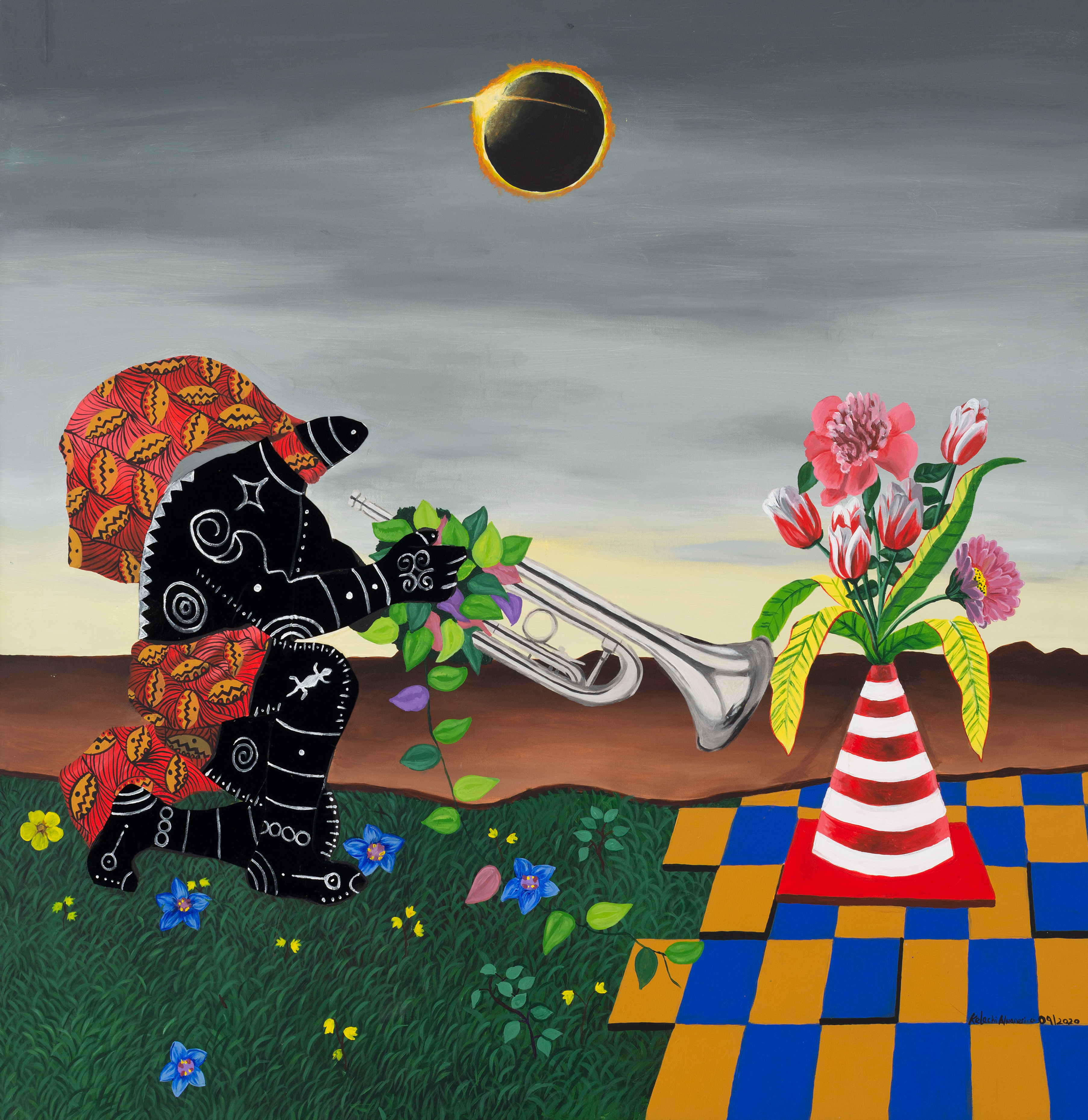 There is a greater narrative in Kelechi’s work, going beyond self and culture. The artist continues: “There are things affecting the world around me that I also find troubling. The deforestation in Brazil and fires in Australia and the United States are related to global warming. The rising oceans have caused flooding around the world. I made paintings in response to flooding in Lagos. I’ve also represented these concerns through the addition of wind towers, which provide clean energy, and flowers and plants, which are needed to protect the environment against climate change.”
