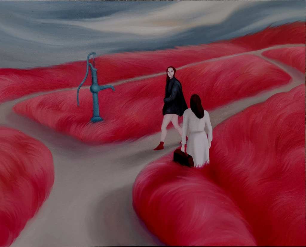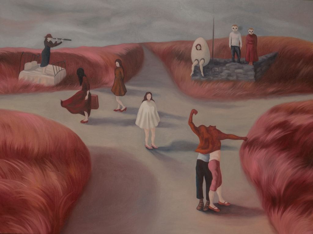 “Her characters are literally and figuratively at a crossroad, this sense of stillness amplified—as in the works Terminal and Hometown—by populating her space with numerous figures, each frozen in place and keeping distance from one another. Through it all surrounds surreal foliage that evoke a veld of veins and capillaries more than grass, suggesting an internal state of mind rather than a mere external backdrop.”