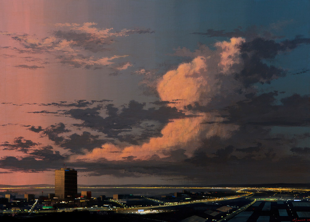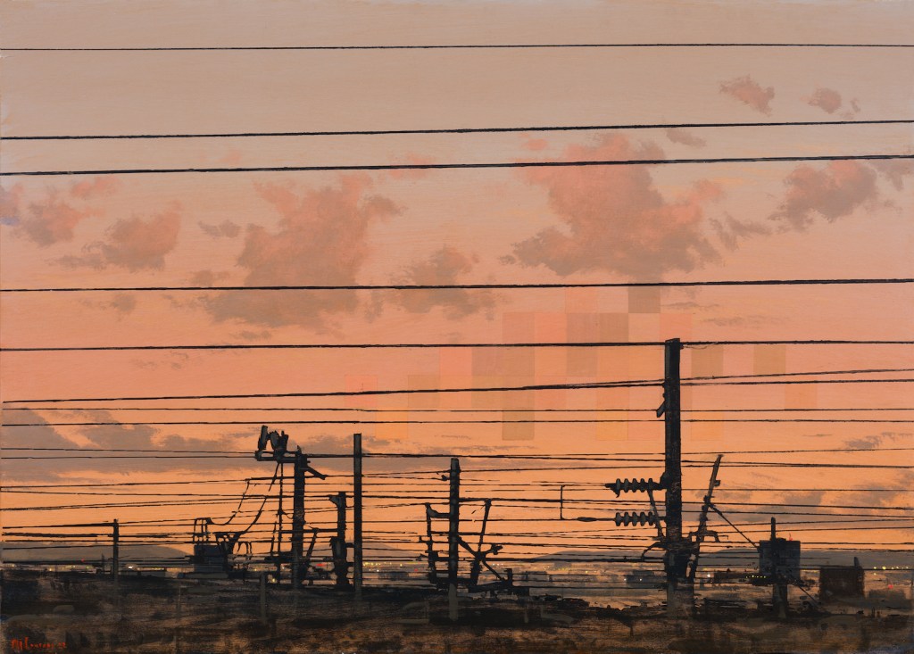 The light (blue making way for soft splashes of pink or orange or red making way for grey) creates a dreamy mood. The landscape features expanses of almost wild earth punctuated by structures of industry—wire fences, factory towers—erected and organised with a sense of confidence and the promise of progress.