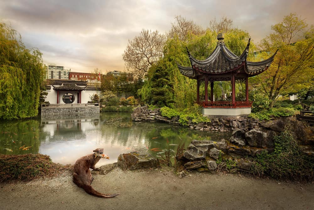 In the images, Lanthier chronicles local Vancouver wildlife stories, including the Chinatown Otter, a river otter that “broke into” Sun Yat-Sen Park and ate several of the prized koi fish, prompting rival social media fans using the hashtags #teamotter and #teamkoi. The Olympic Village Beaver is depicted, drawing parallels to Vancouver’s always-challenging housing situation. And there’s The Crow Commute, a daily happenstance in which thousands of crows fly just before dusk to the Still Creek area of Burnaby, echoing the evening rush hour. Vancouver’s “unofficial ambassador” Canuck the Crow is featured in this image as well.