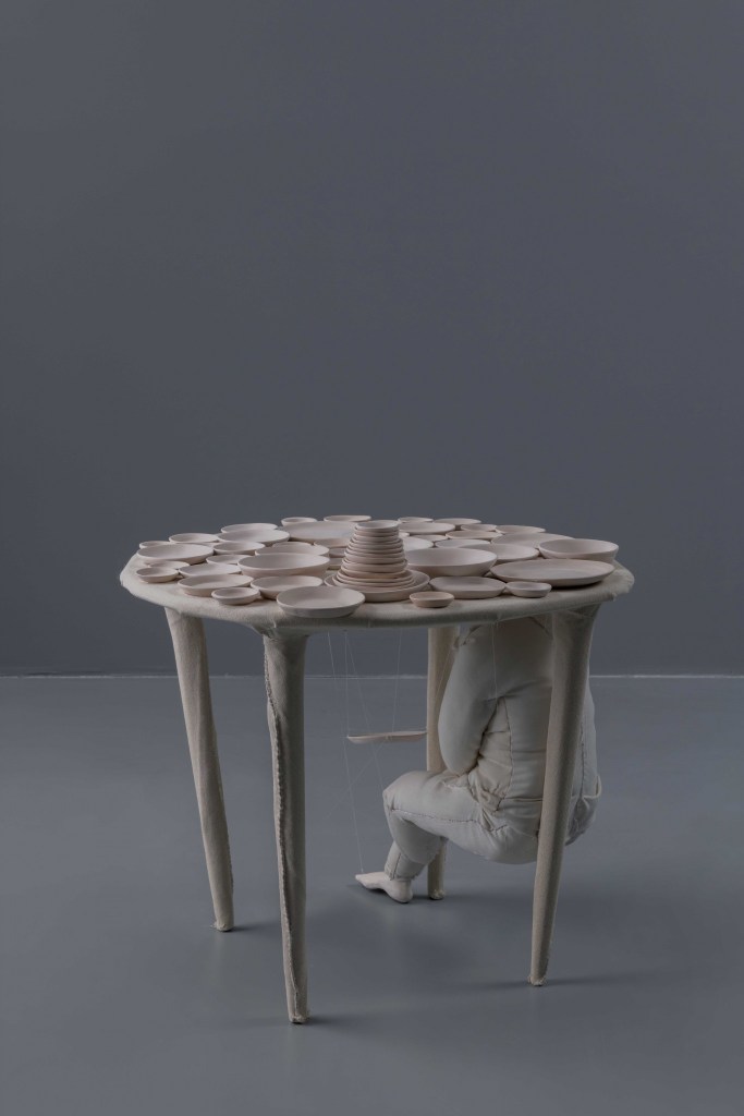 Composed of fabric, terracotta, and ceramics, Slope displays a figure whose feet do not touch the ground despite the sloping ground they are on and the load on their back. The individual who falters in the sloping structure of the ground they are on is disconnected from reality with their burdens, thus hanging in the air. The sculpture named Blackout qualifies as a document of escape. The feet are on the stage which are the carriers of the body that hides away in order to protect from the invisible enemy.