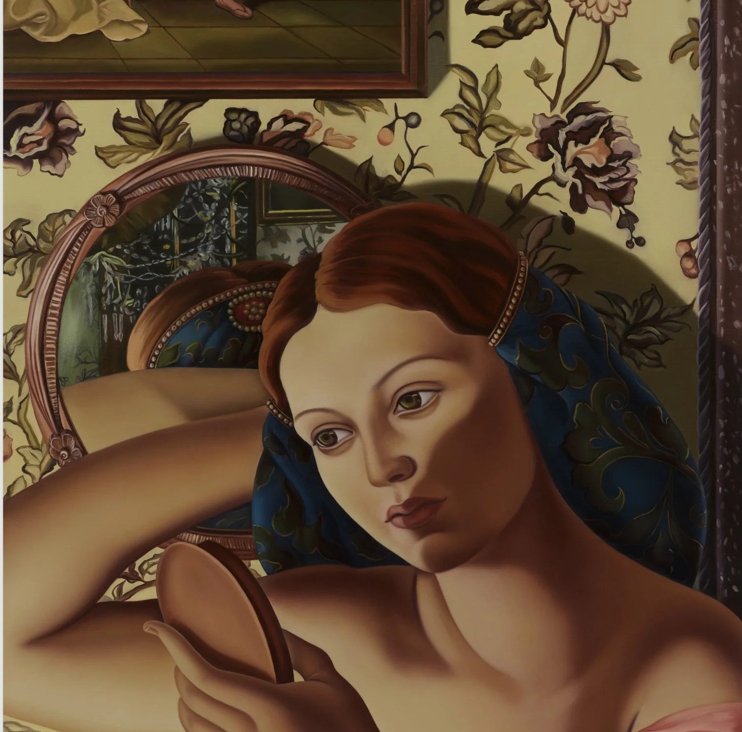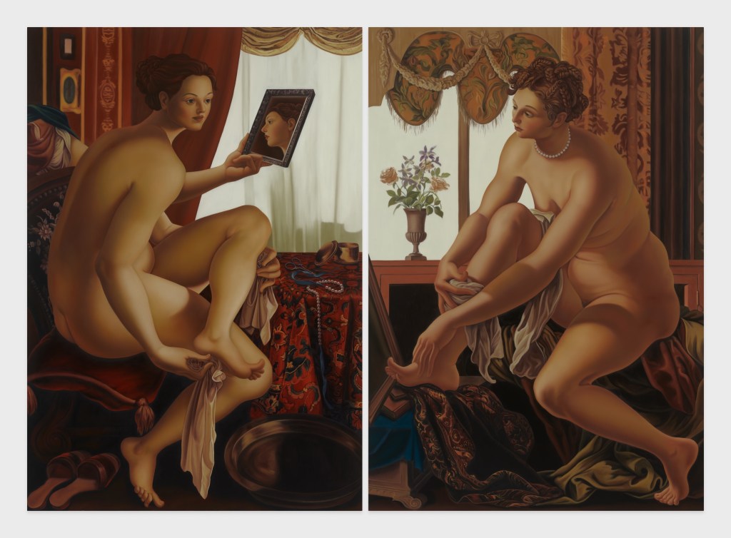For centuries, images of women painted by men have depicted women’s beauty and nudity in the service of revealing an innate feminine vanity, greed, or wantonness. Mockrin reveals whose narcissism and gratification is truly on display. Through the artist’s contemporary feminist lens, the mirror becomes the tool through which her sitters recognise themselves as both the object of desire and a powerful subject whose agency is antithetical to their original narratives.