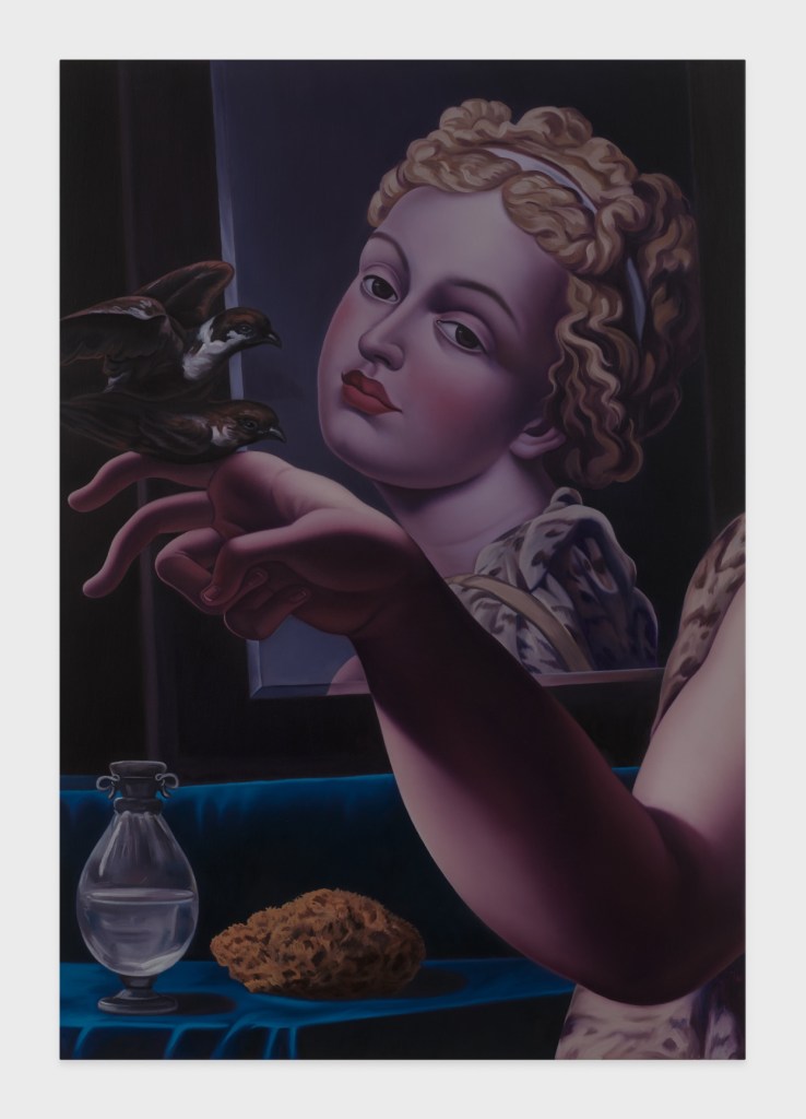 Mockrin’s paintings are characterised by a tightly controlled surface and a sense of internal light that seems to diffuse from within the bodily forms to their smooth edges. The artist builds at least three layers of paint on the skin of her figures, blended to obscure any visible brushstroke. That these hyper-even, eerily bloodless complexions suggest plaster or AI-generated Instagram filters rather than human flesh is an intentional extreme. “I feel we see it in plastic surgery all the time,” Mockrin notes. “The pursuit of the ideal pushes past beauty into the uncanny.” In Herself unseen, 2023, Mockrin plumbs this strangeness to reveal a timeless ambivalence towards one’s own reflection. A mirror evokes vanity as much as it allows for self-contemplation. As Mockrin writes, “‘Herself unseen’ refers to the fact that despite [the sitter] viewing her image in not one but two mirrors, the parts of her that matter most remain unseen by the artist, by us, and possibly by herself.”