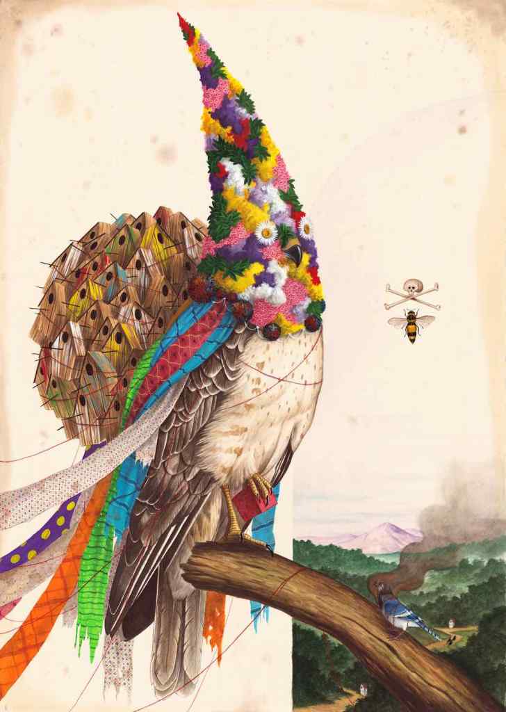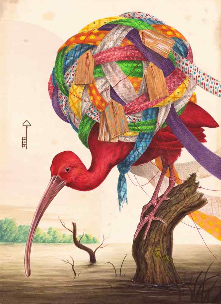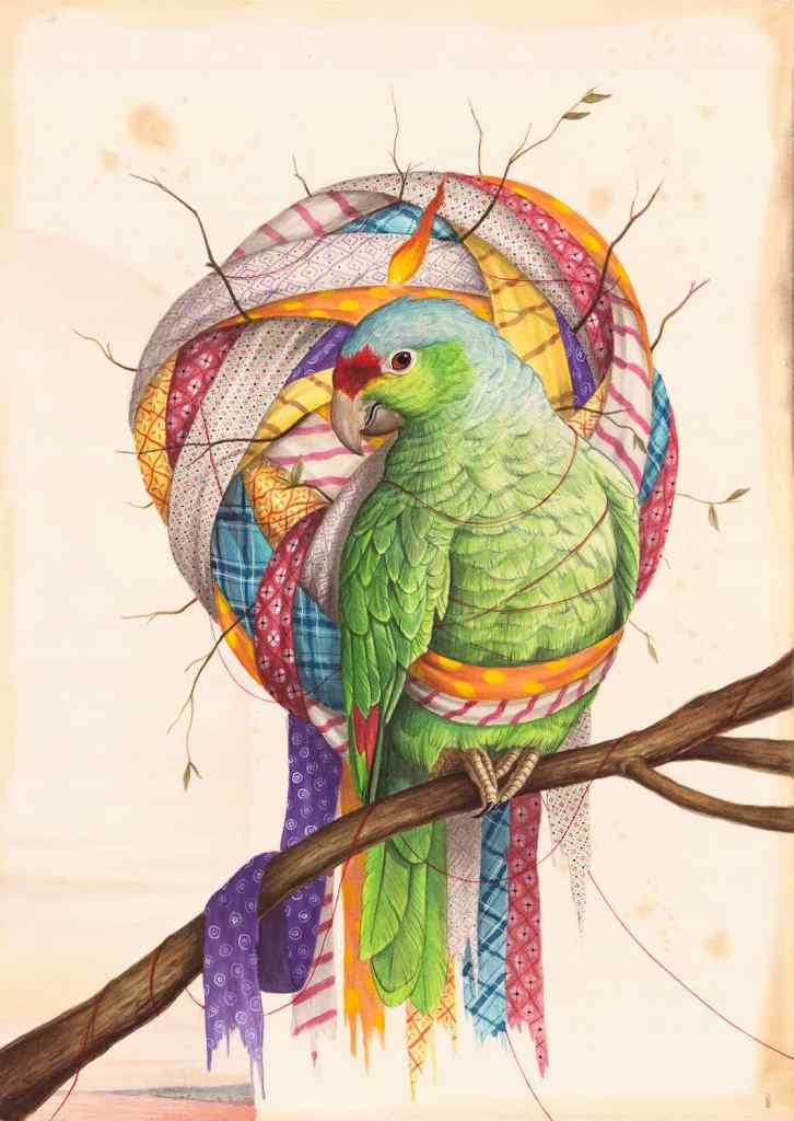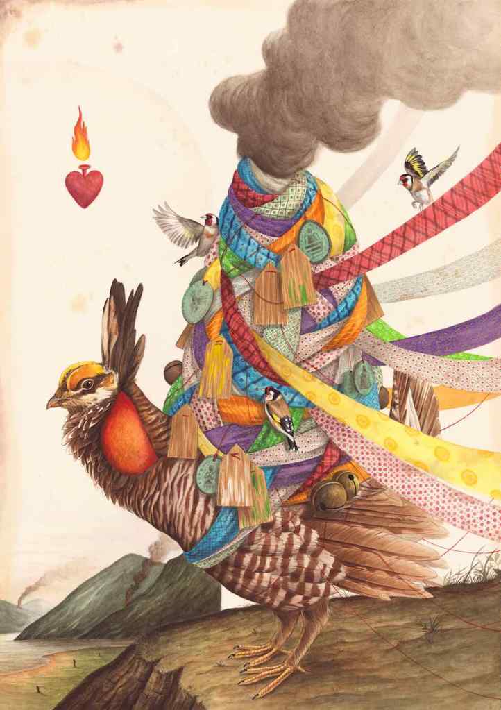 The paintings depict magical birds as if they were bag ladies or hobos, inhabitants of an endless forest given over to perpetual wandering. Compulsive hoarders, they carry their worlds on their backs, craving the comfort of everyday objects until they become patterned by their cargo. Their hybrid adornment is reminiscent of syncretic saints and shamans, where each fabric is imbued with a sense of meaning and hope. The fires that surround these birds echo this most basic of instincts: to fetishise objects, giving them meaning beyond themselves, and carrying them with us as if we were keeping a flame alive.