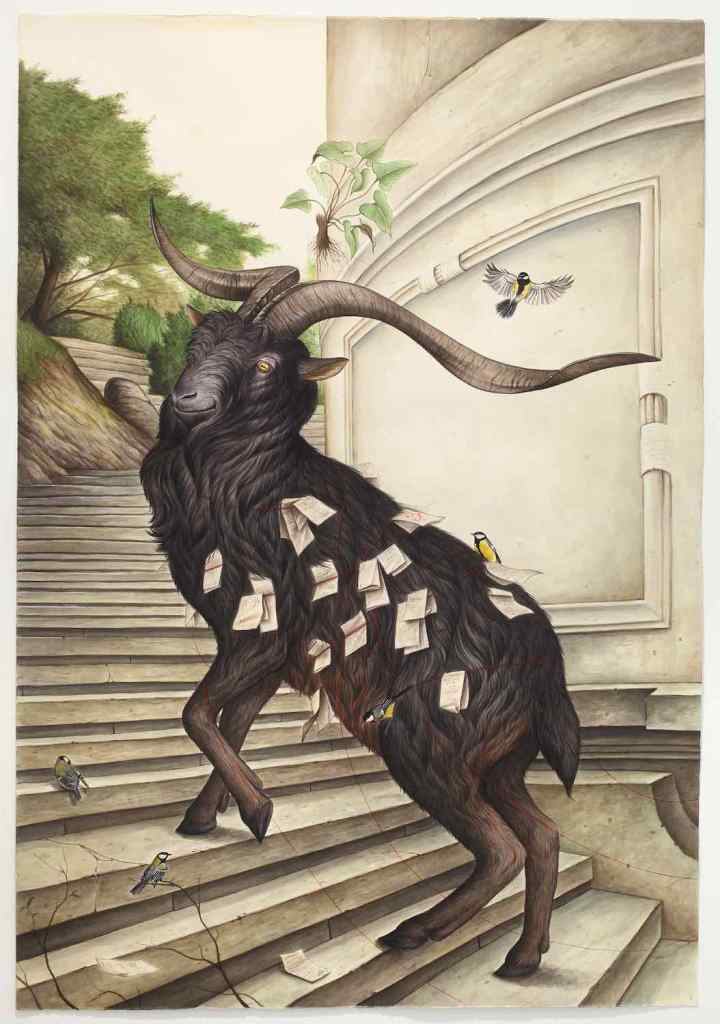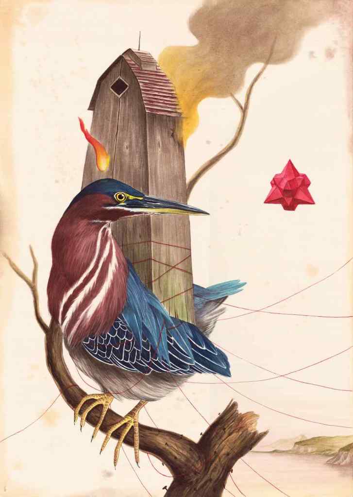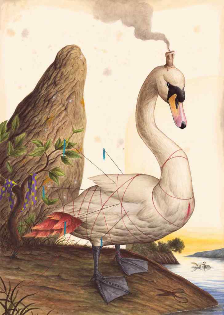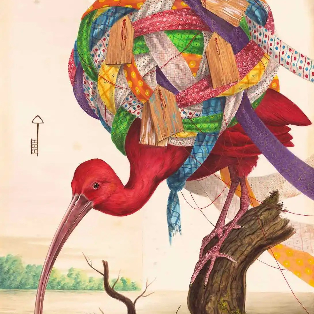 The paintings depict magical birds as if they were bag ladies or hobos, inhabitants of an endless forest given over to perpetual wandering. Compulsive hoarders, they carry their worlds on their backs, craving the comfort of everyday objects until they become patterned by their cargo. Their hybrid adornment is reminiscent of syncretic saints and shamans, where each fabric is imbued with a sense of meaning and hope. The fires that surround these birds echo this most basic of instincts: to fetishise objects, giving them meaning beyond themselves, and carrying them with us as if we were keeping a flame alive.