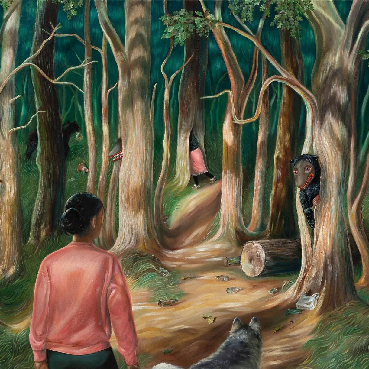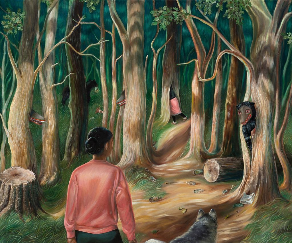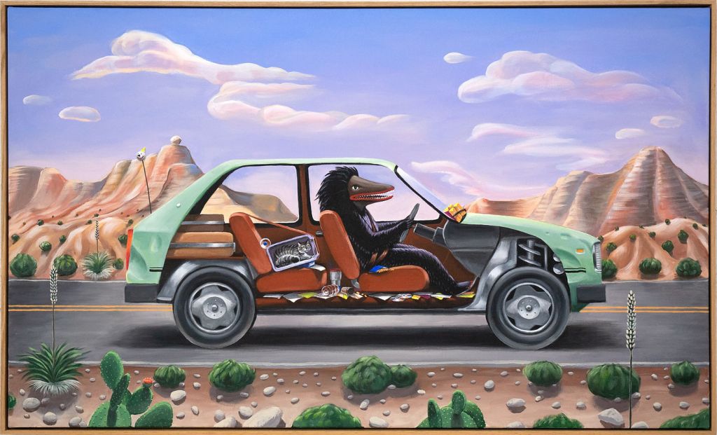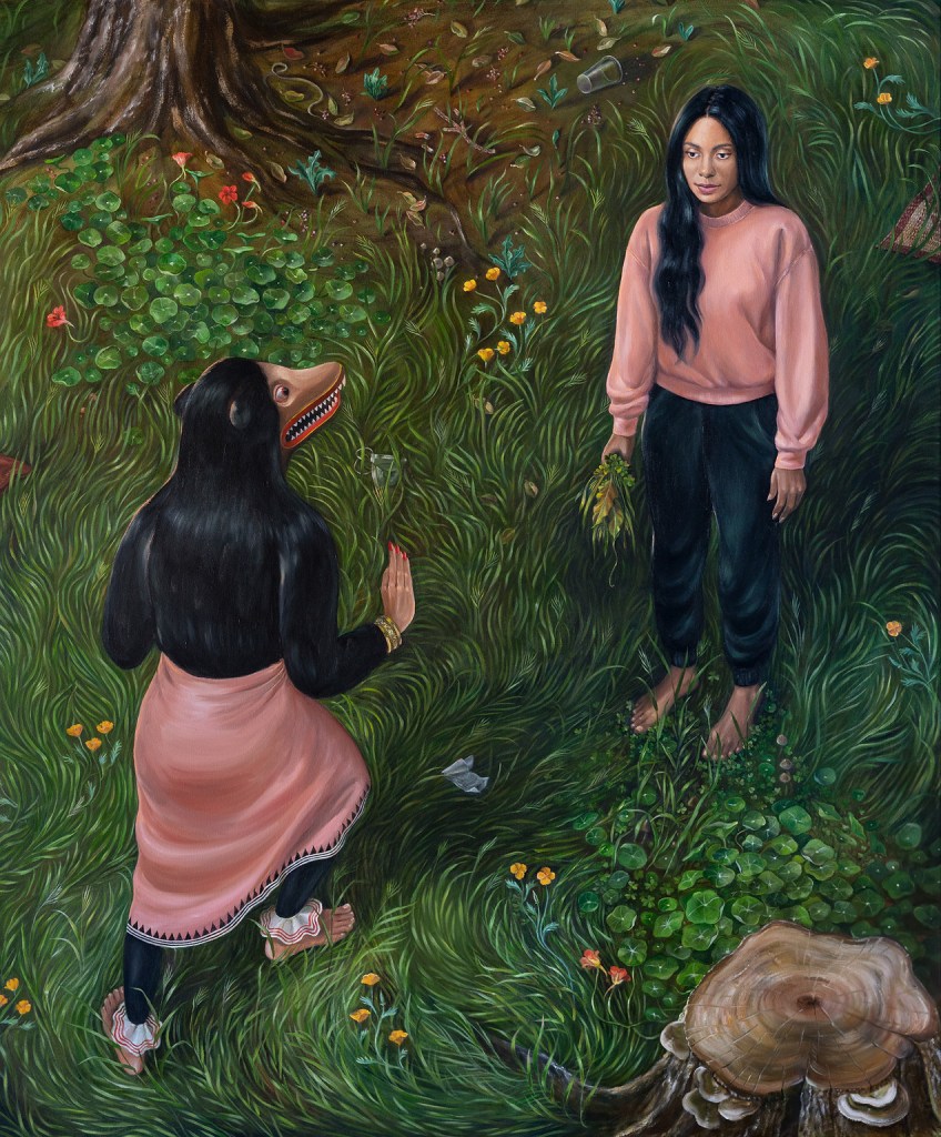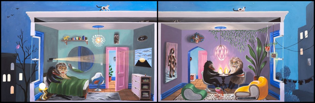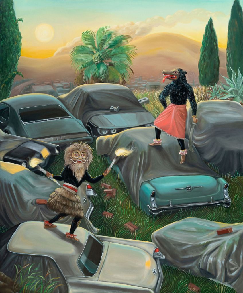 The artist introduces the project: “In mundane American scenes from my own life, the Yakkas go about their daily lives and occasionally interact with people. The all-night ritual of Thovil (which could be described as a roast disguised as a ceremony in honor of the Yakkas) has more relevance today as tourist spectacle than for its intended purpose as an occult healing ritual, but I’m interested in the purpose they once served for communities who embraced them since pre-Buddhist times on the island. The original symbolism of the Yakkas is also used in scenes where I combine self portraiture with Yakkas who act out my own inner conflicts.”
