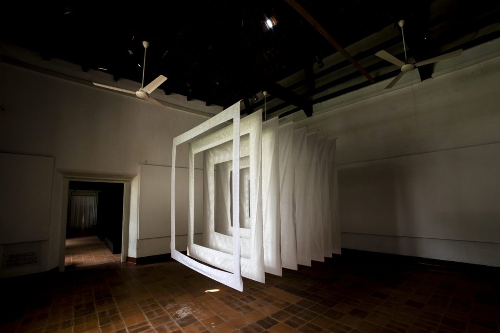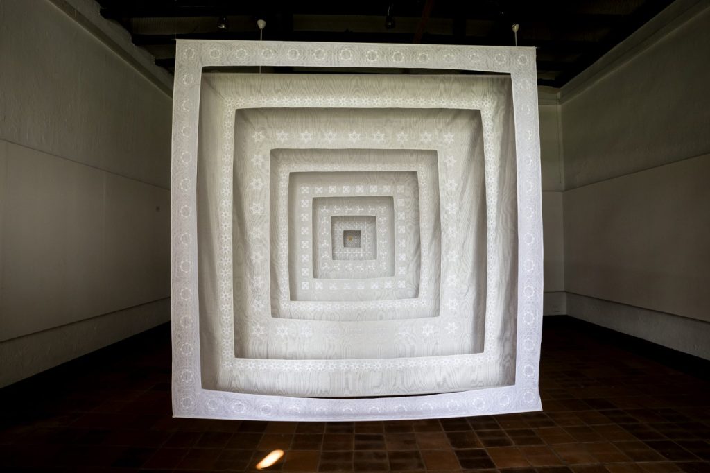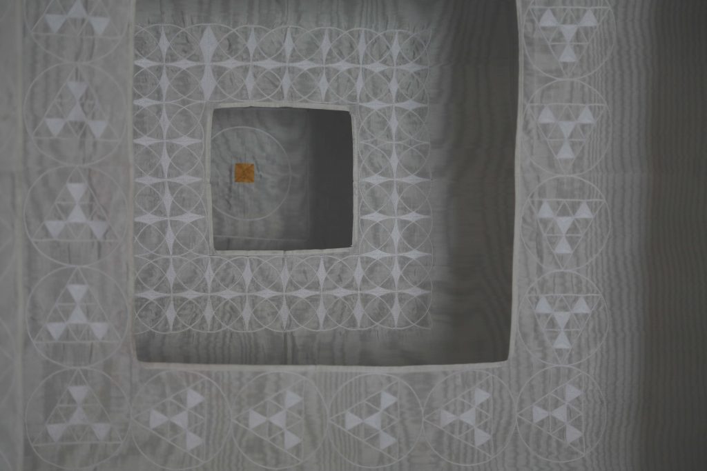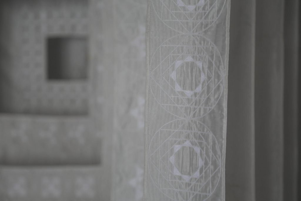 Awartani has responded to this literature by creating eight hanging embroidery panels. They are intricate and meticulously patterned, hand embroidered by textile craftsmen in India, steeped in the study of mathematics. The patterns themselves come from the traditions of sacred geometry and the artist uses them to create genealogies of meaning that act as a form of meditation, praying contemplation and search for the inner spirit rather than outer. When hanging they create a perfect cube but are truly activated by light cascading through the stepped layers, carving out a meditative inner expression.